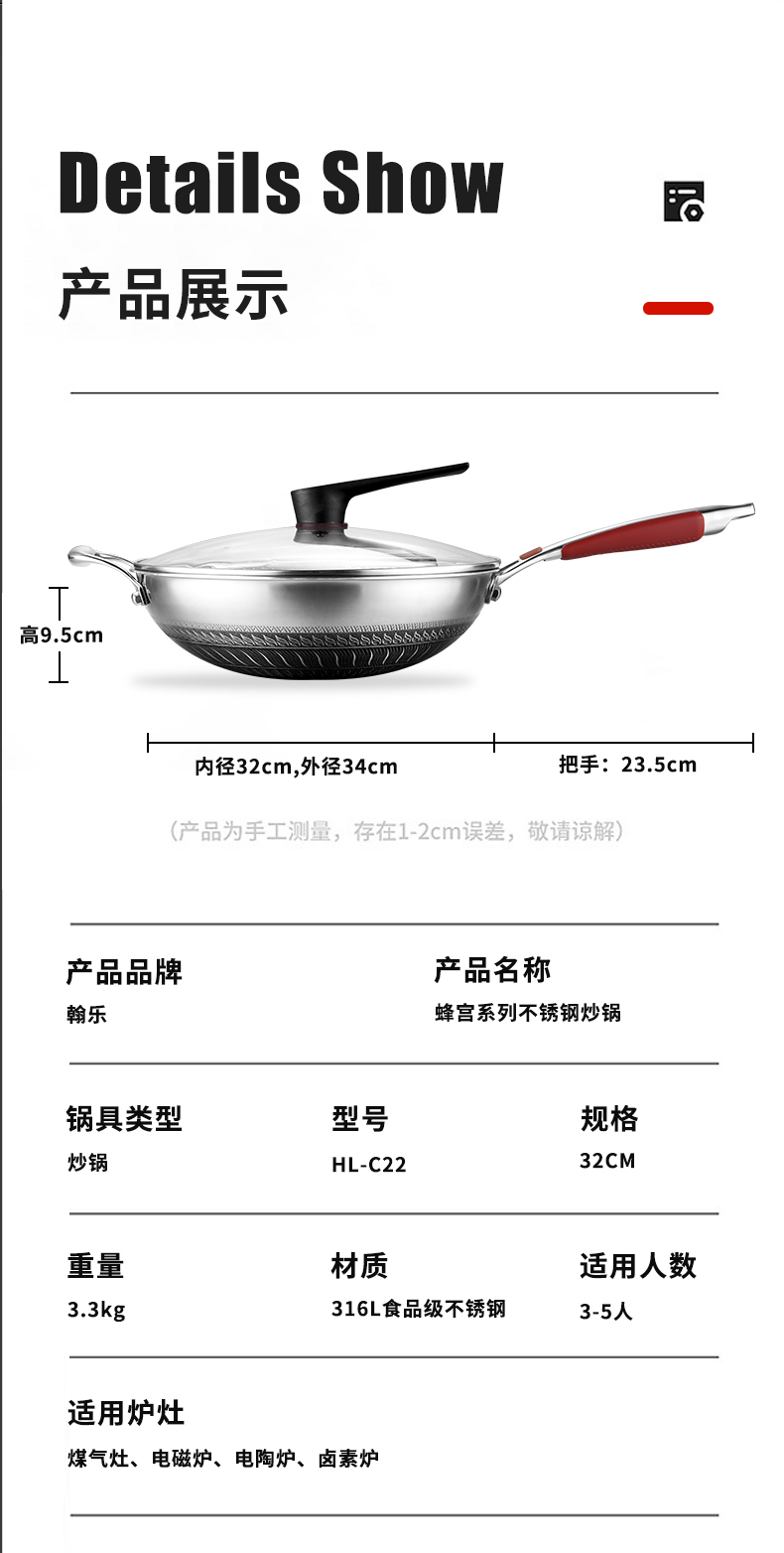 hanle/翰乐蜂宫系列32cm不锈钢炒锅HL-C22