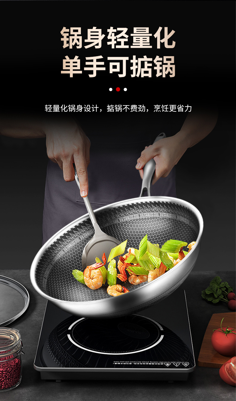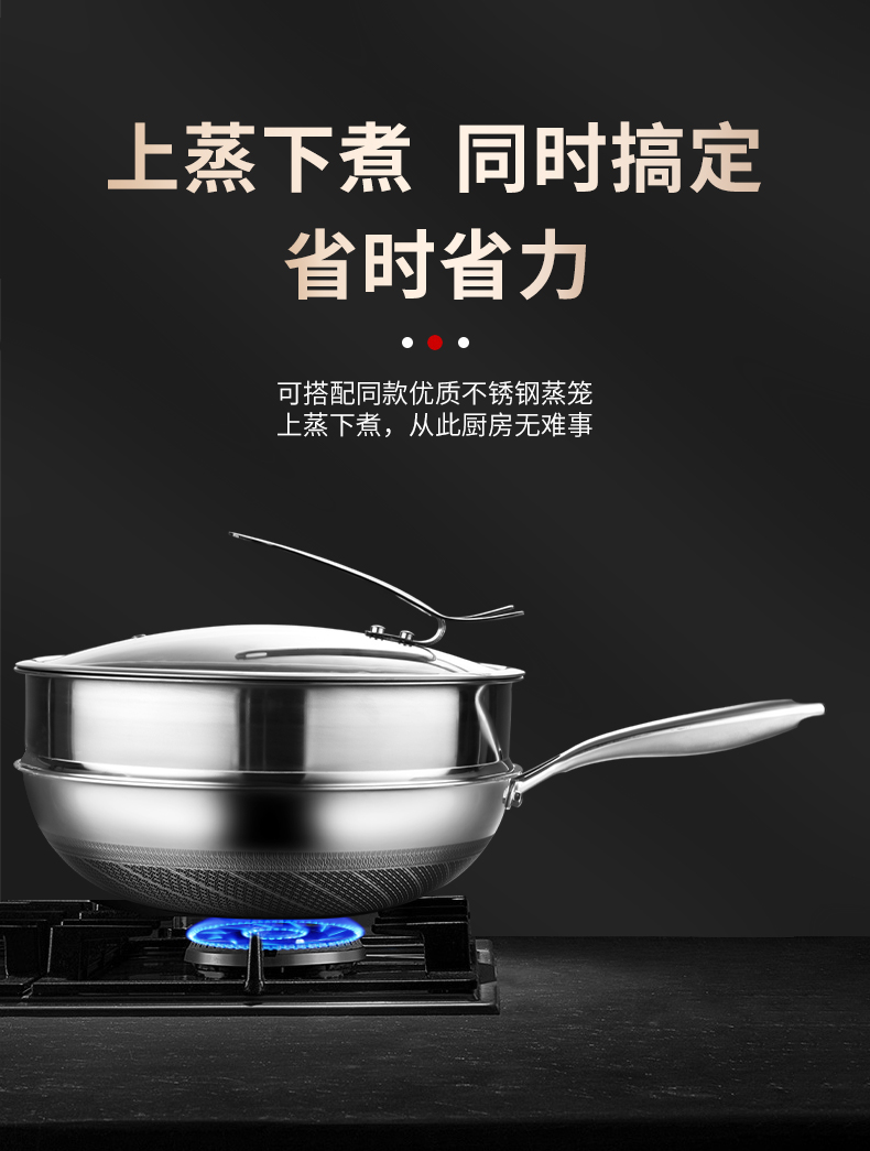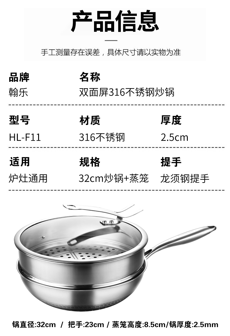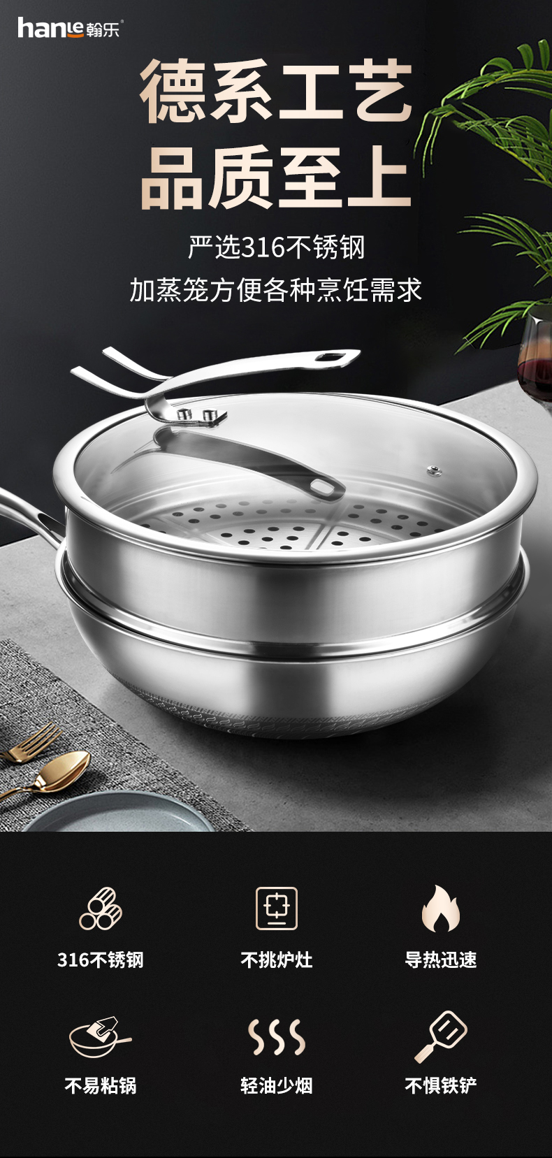 商品名称:hanle/翰乐32cm双面屏316不锈钢炒锅带蒸笼HL-F11