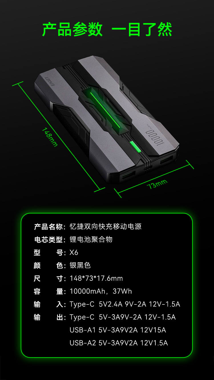 商品名称:EAGET/忆捷10000毫安双向快充移动电源X6