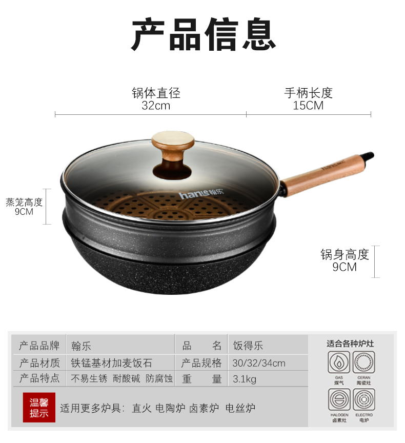 商品名称:hanle/翰乐32cm饭得乐麦饭石不粘炒锅HL-C10