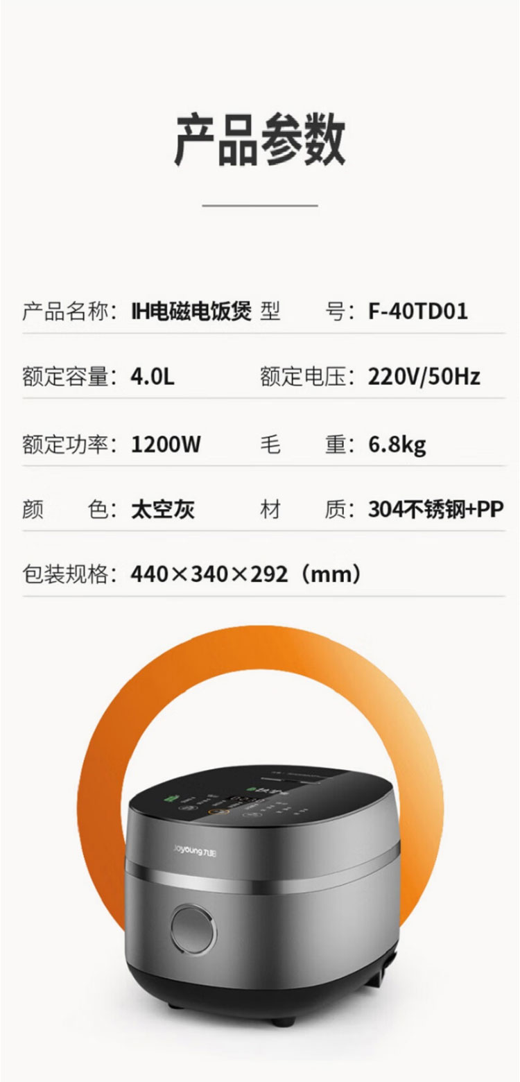商品名称:Joyoung/九阳4升lH电磁低糖电饭煲F-40TD01