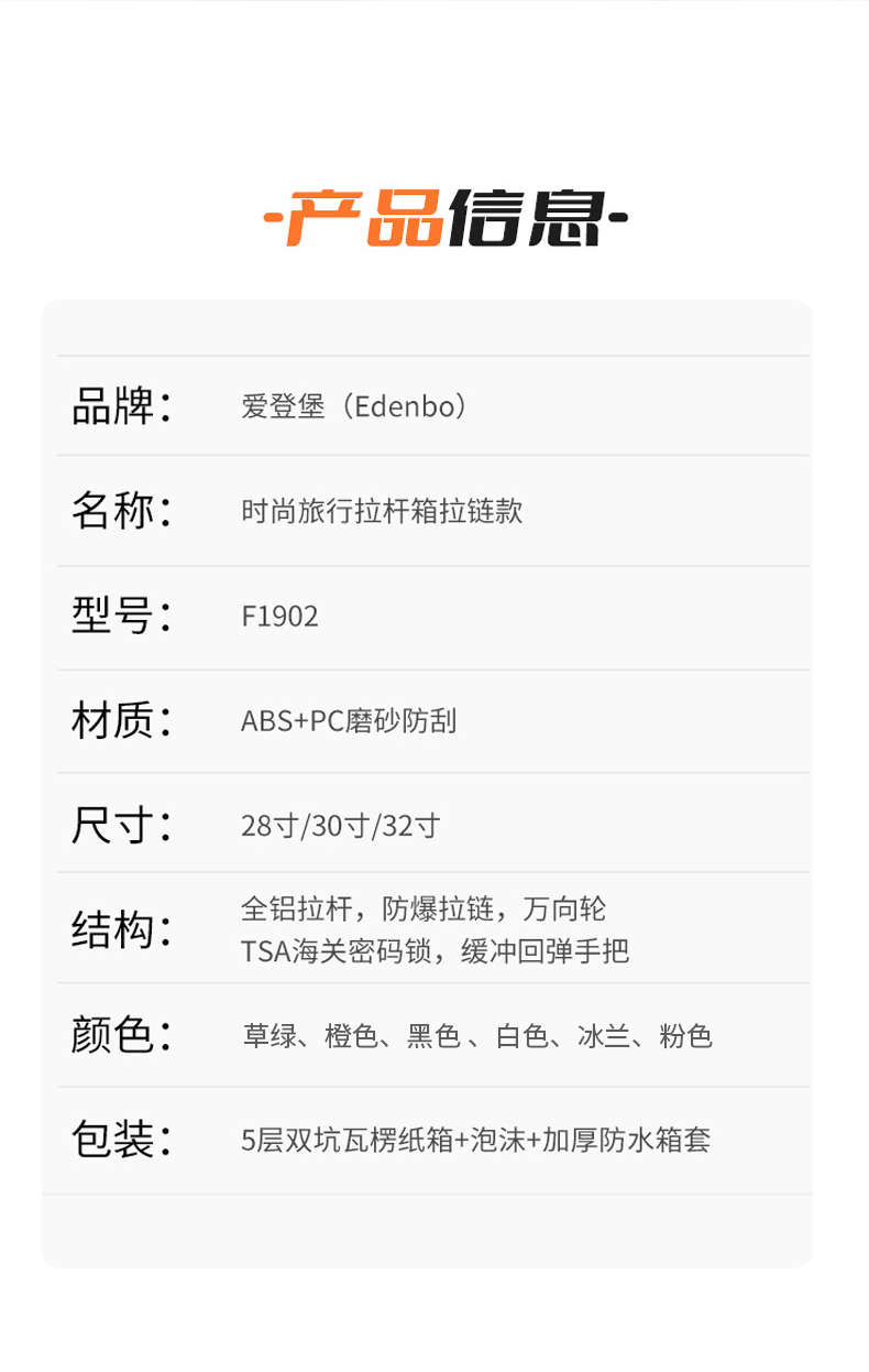 商品名称:Edenbo/爱登堡时尚旅行拉杆箱拉链款F1902