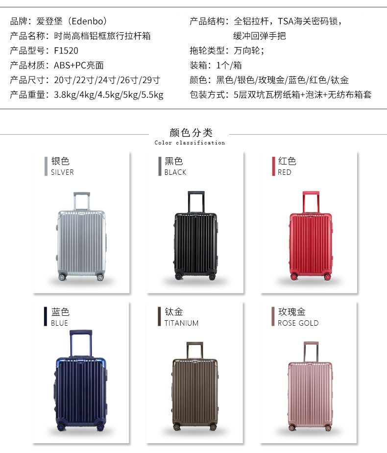 商品名称:Edenbo/爱登堡时尚高档铝框旅行拉杆箱F1520