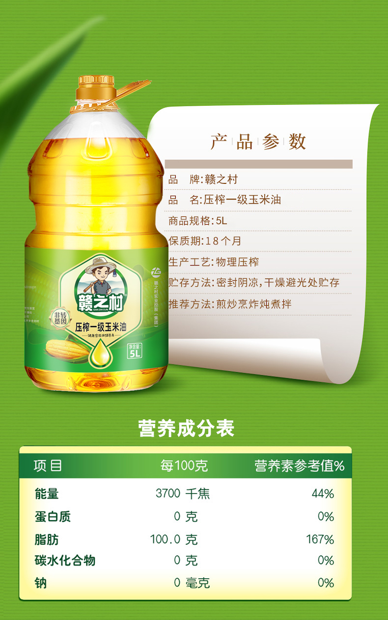 商品名称:赣之村非转基因压榨一级玉米油5L