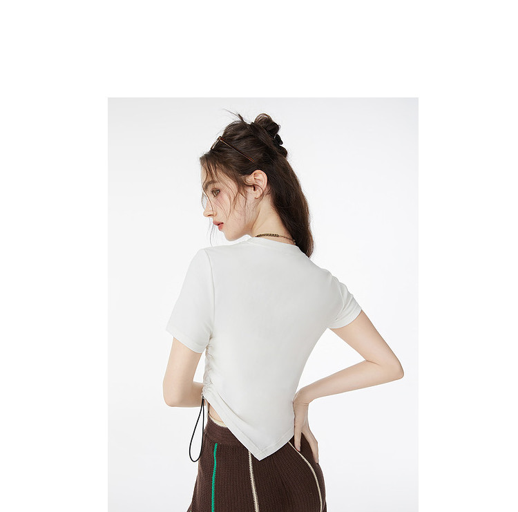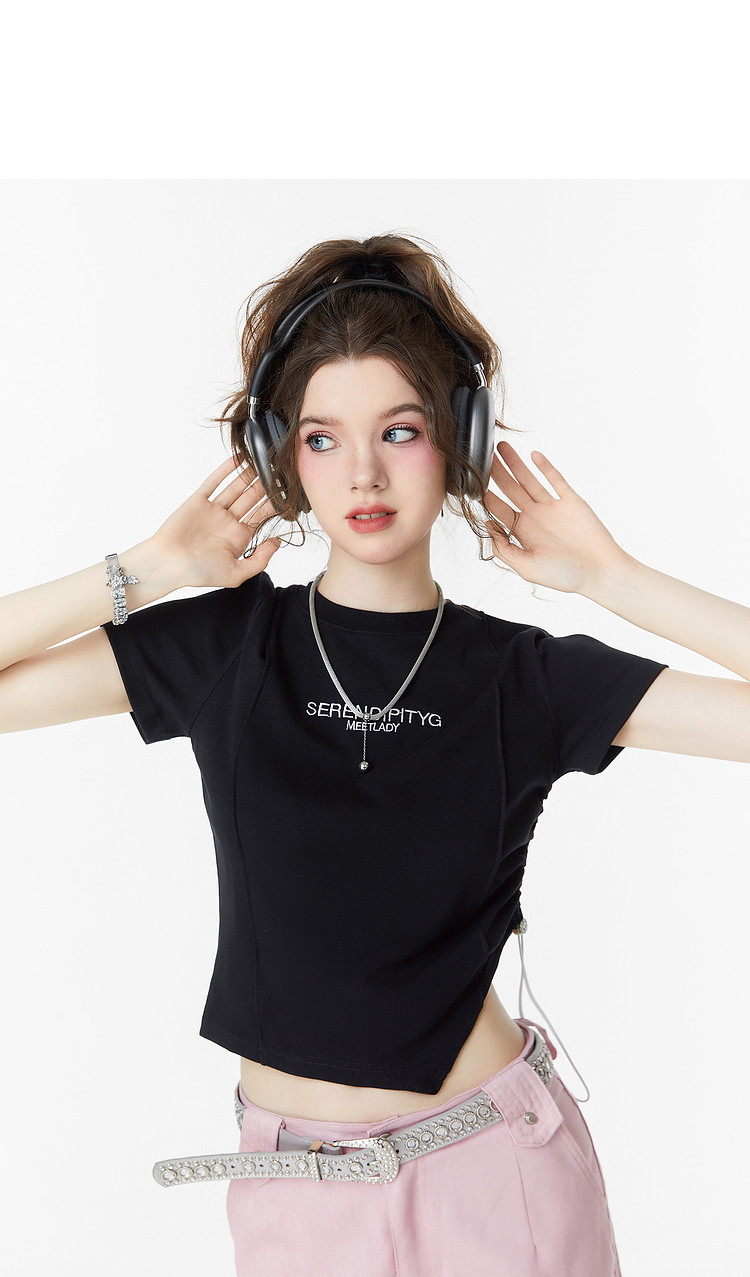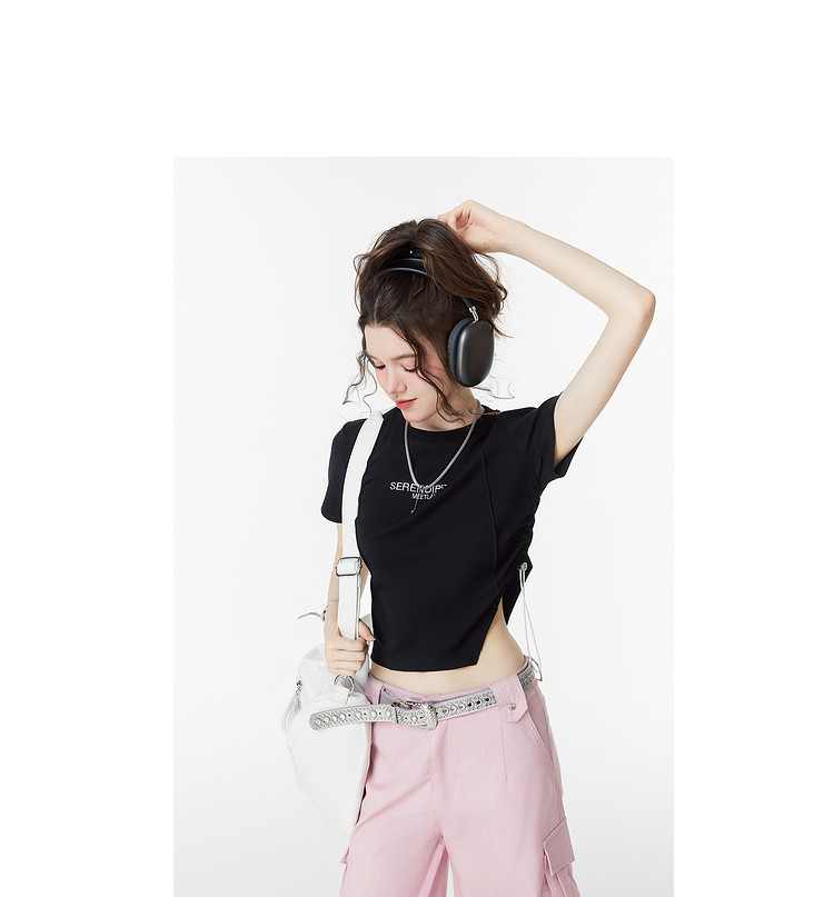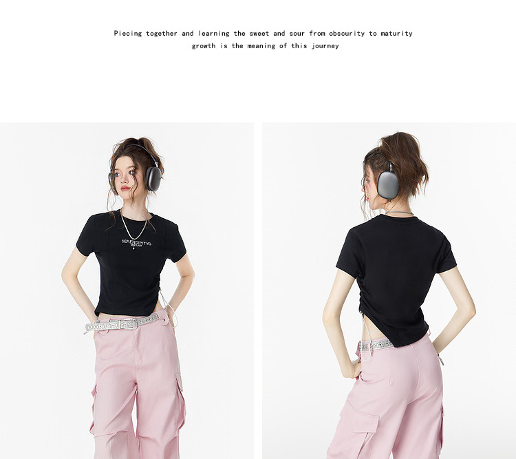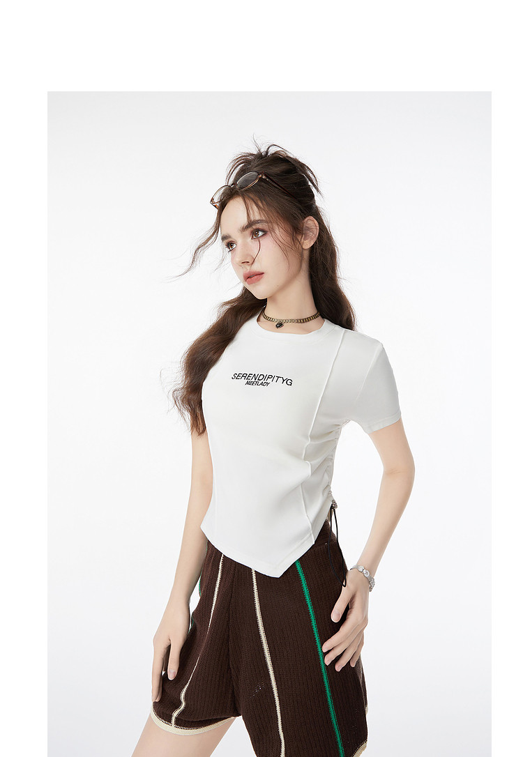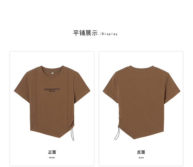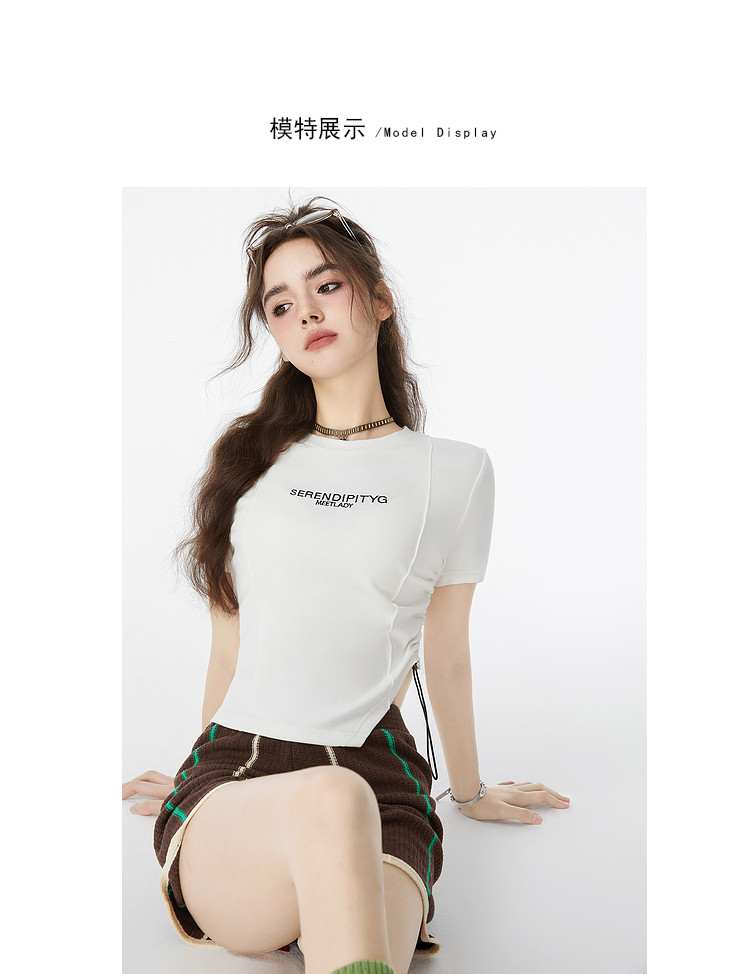 商品名称:夏装百搭纯色短袖t恤女辣妹字母绣花抽绳上衣 510804