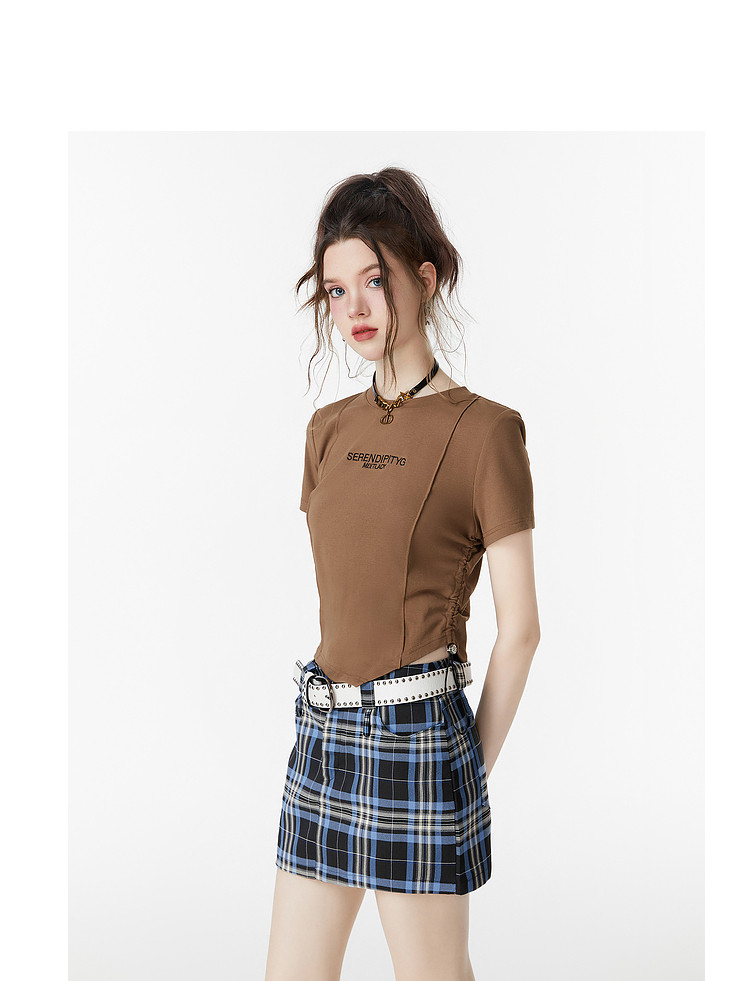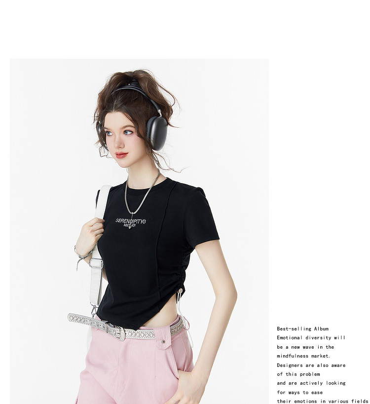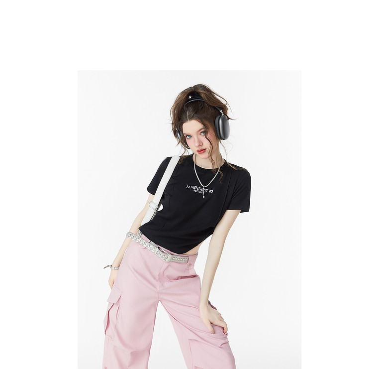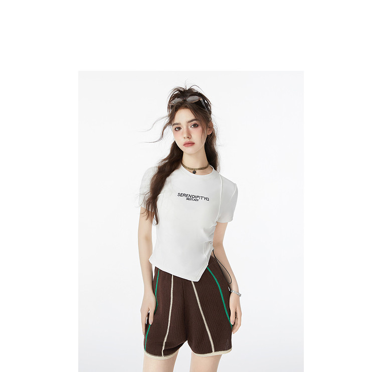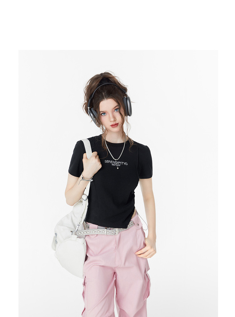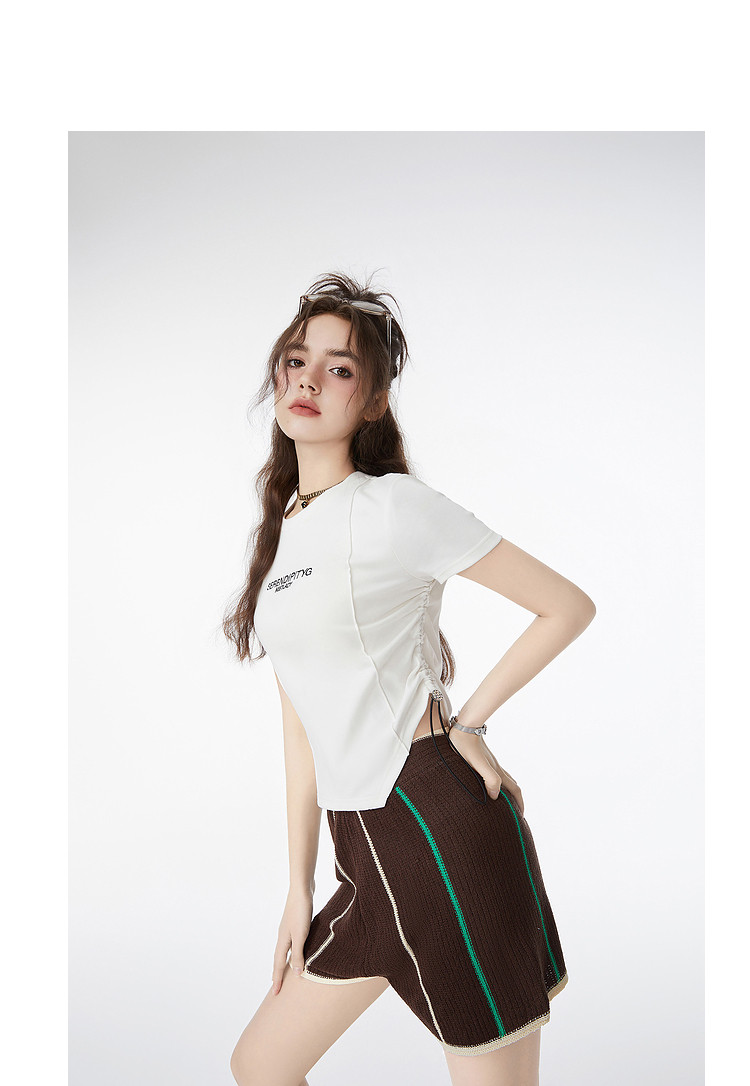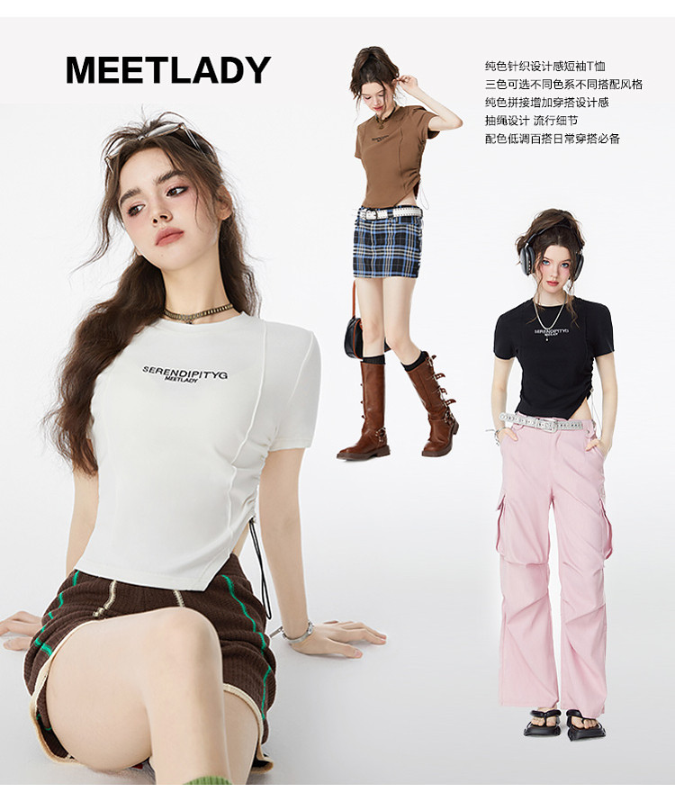 商品名称:夏装百搭纯色短袖t恤女辣妹字母绣花抽绳上衣 510804