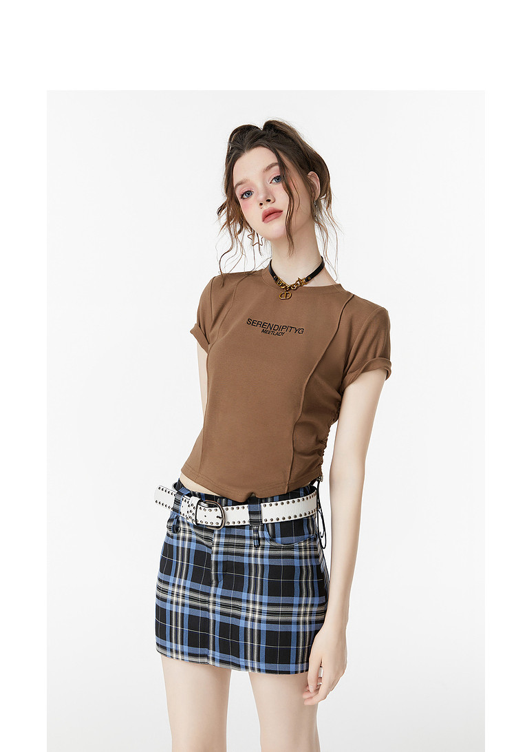 夏装百搭纯色短袖t恤女辣妹字母绣花抽绳上衣 510804