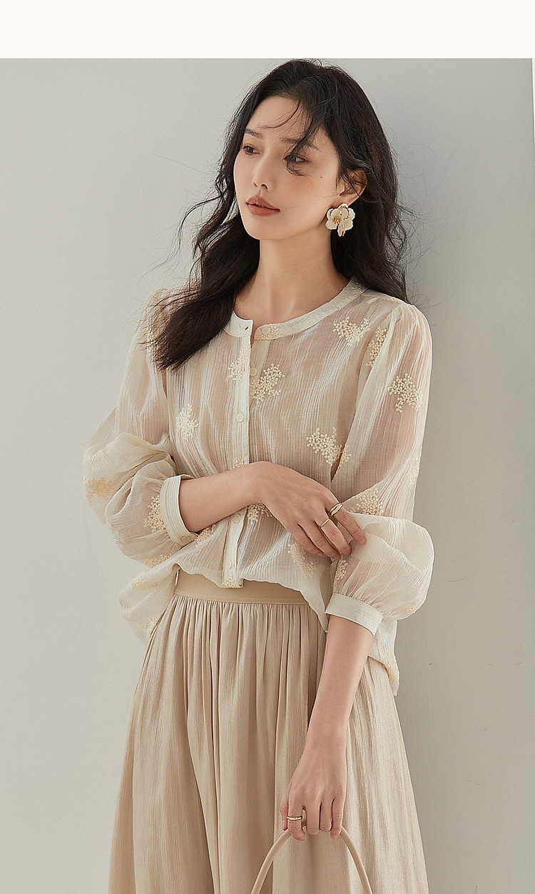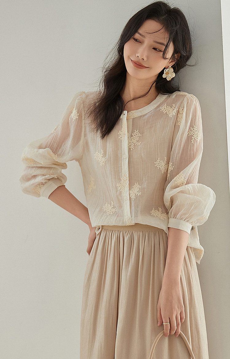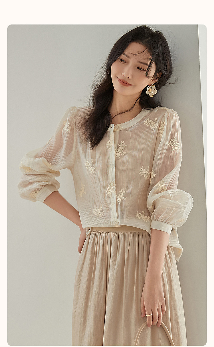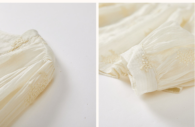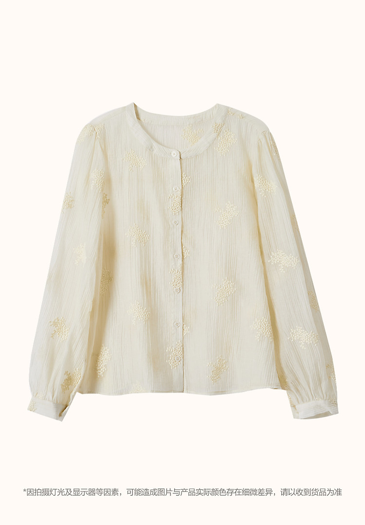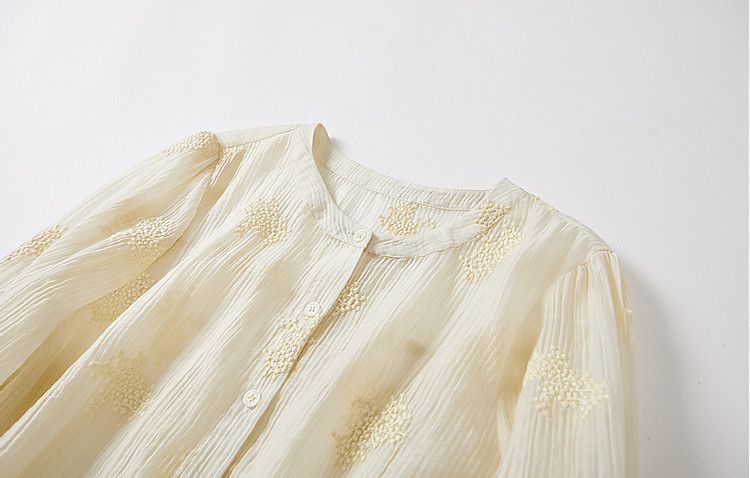 商品名称:【轻薄莱赛尔】春秋淑女刺绣褶皱衬衫泡泡袖小个子衬衣女装上衣 030913