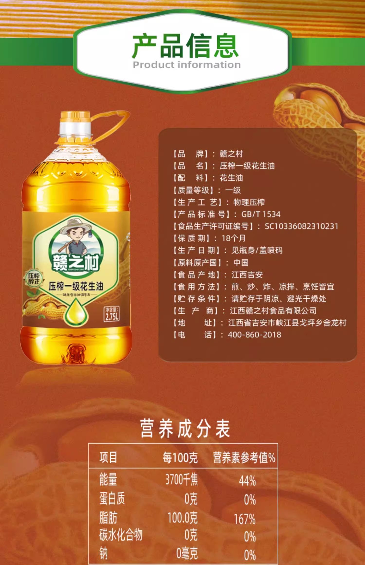 商品名称:赣之村压榨一级花生油2.75L