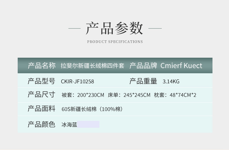 商品名称:Cmierf Kuect/中国CK拉斐尔新疆长绒棉四件套-冰海蓝200*230cm