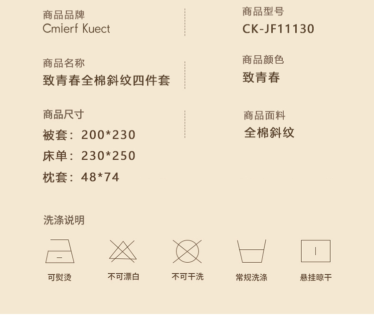 商品名称:Cmierf Kuect/中国CK致青春全棉斜纹四件套200*230cm