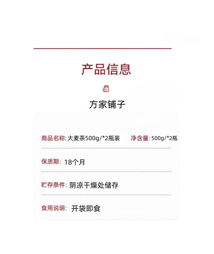 商品名称:方家铺子大麦茶500g*2瓶 新老包装随机不接受指定