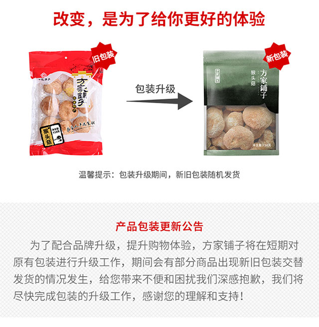 商品名称:方家铺子猴头菇158g*2袋 新老包装随机不接受指定