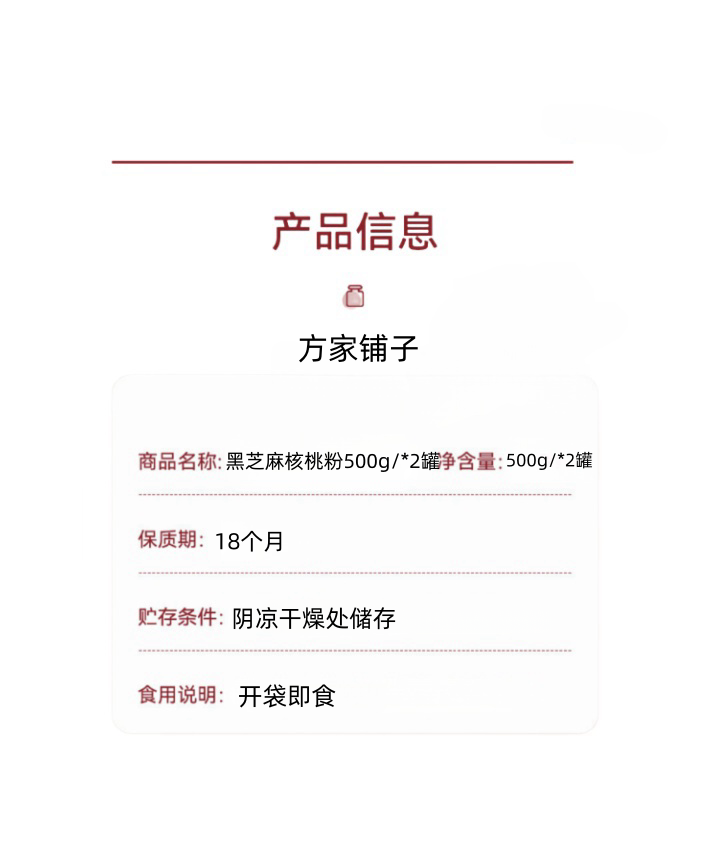 商品名称:方家铺子黑芝麻核桃粉500g*2罐