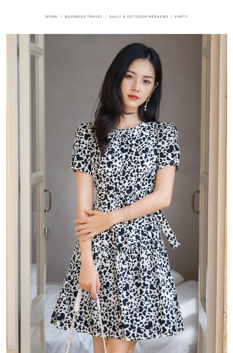 爱心印花连衣裙女独特设计感收腰A字裙子减龄气质短袖圆领连衣裙 106691