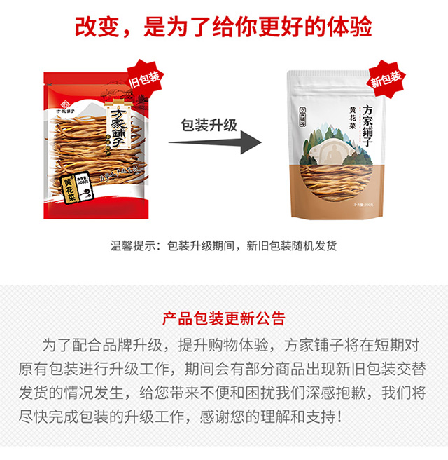 商品名称:方家铺子黄花菜200g*2袋 新老包装随机不接受指定