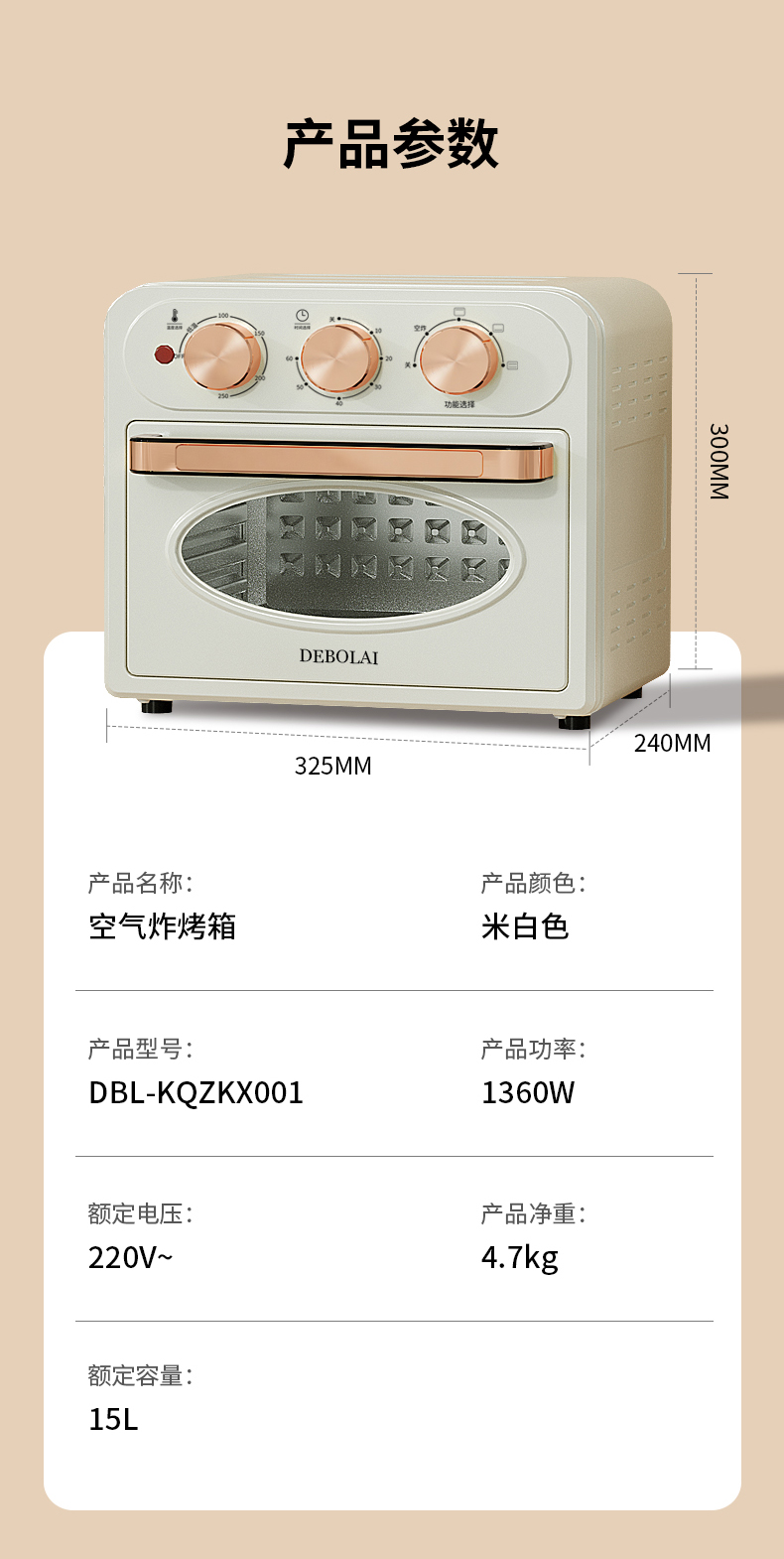 商品名称:德博莱15升西亚多功能空气炸烤箱DBL-KQZKX001