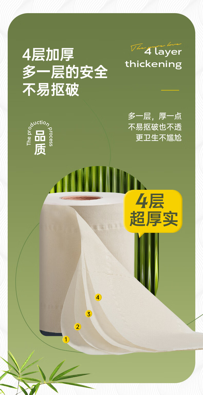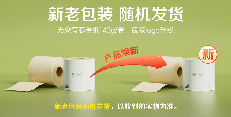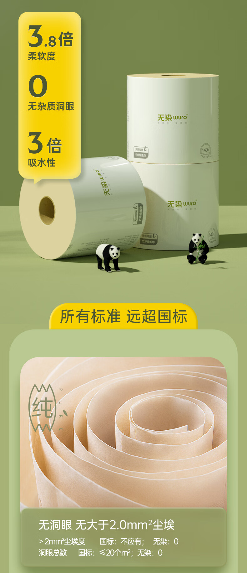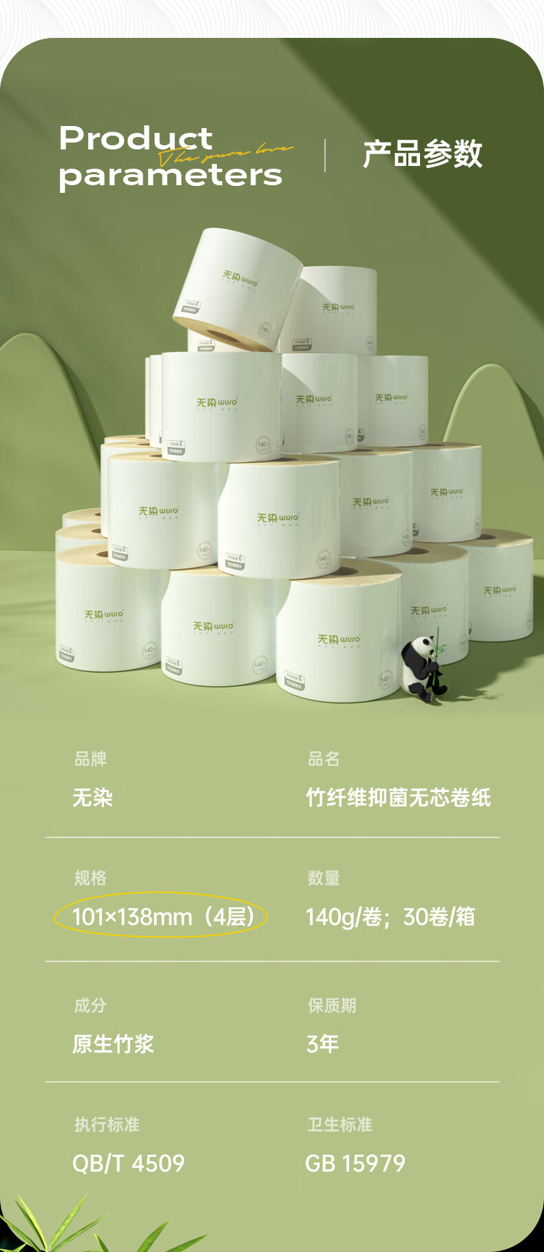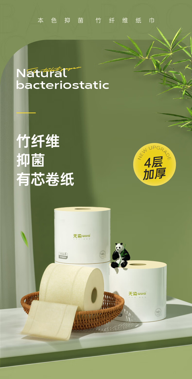 wuro/无染竹纤维抑菌无芯卷纸优享装整箱4层140g*30卷WR016