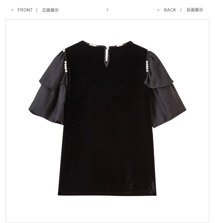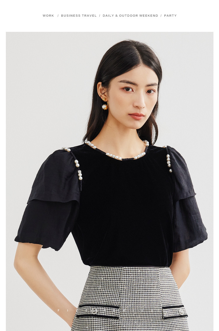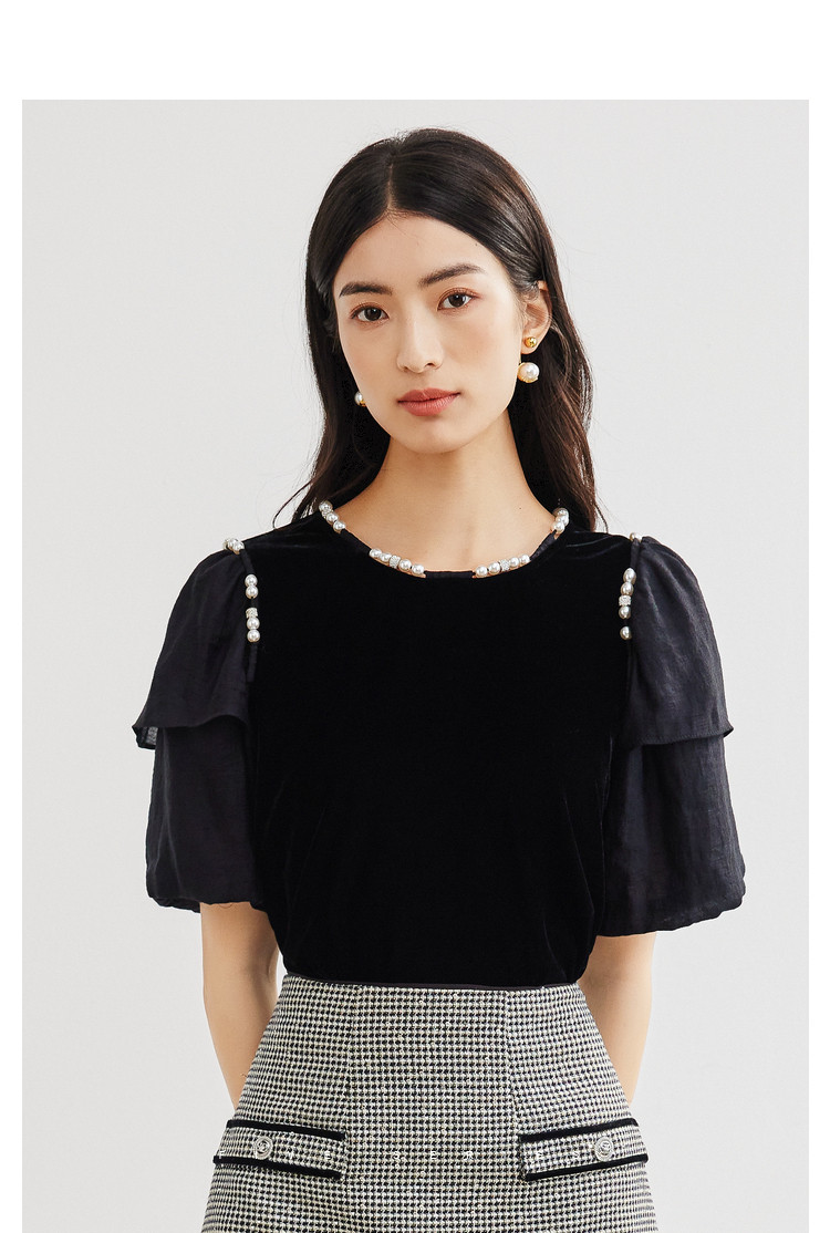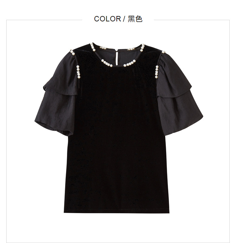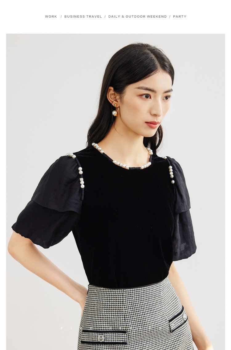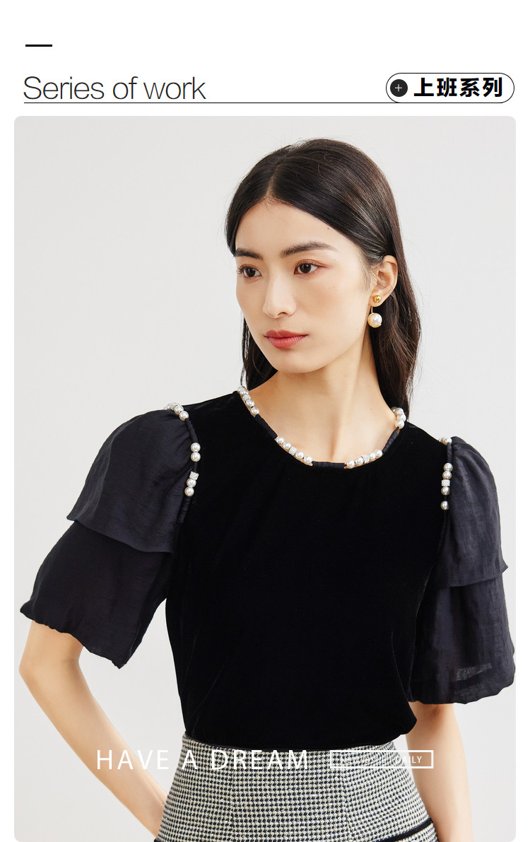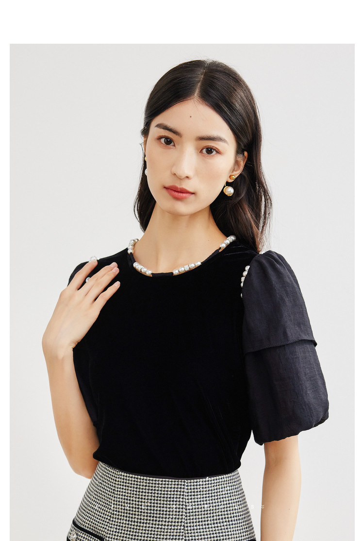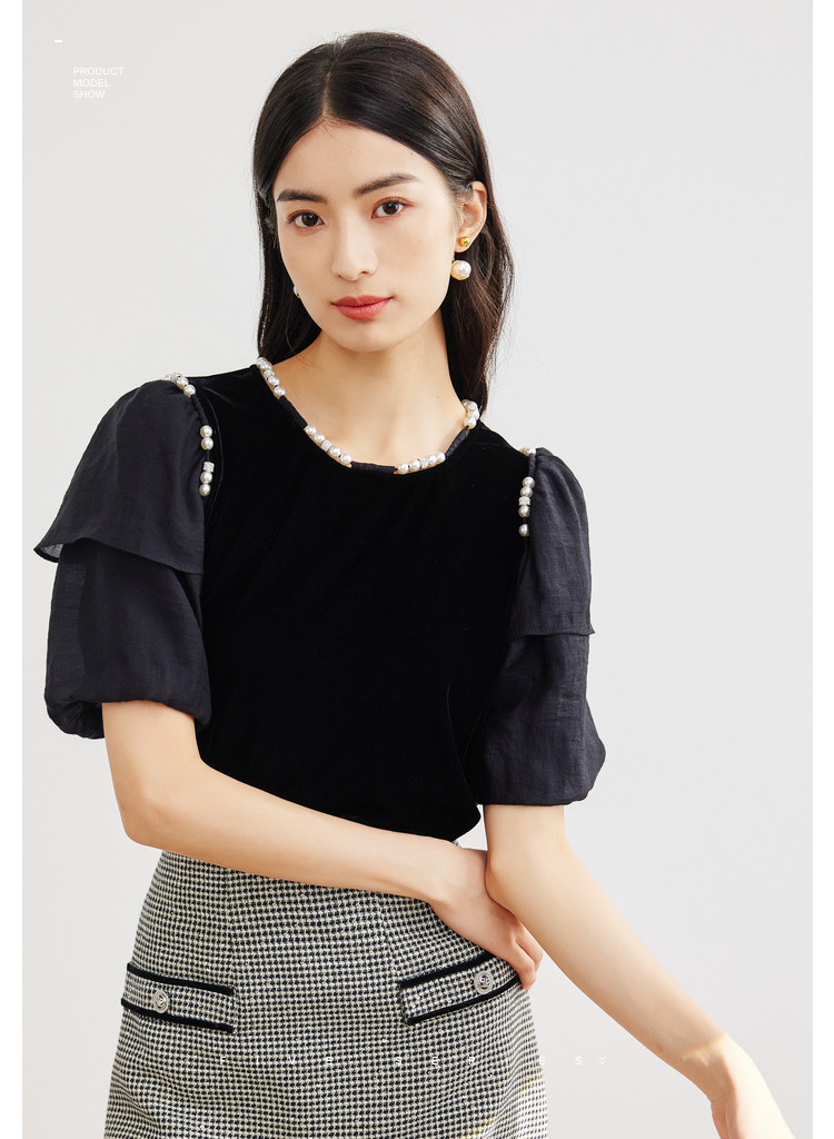 商品名称:泡泡袖短袖T恤女装夏款独特设计感减龄优雅百搭气质黑色上衣 387779
