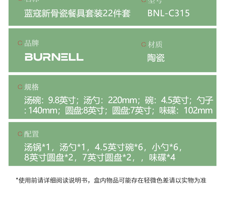 商品名称:BURNELL/巴米樂蓝寇新骨瓷餐具22件套装BNL-C315