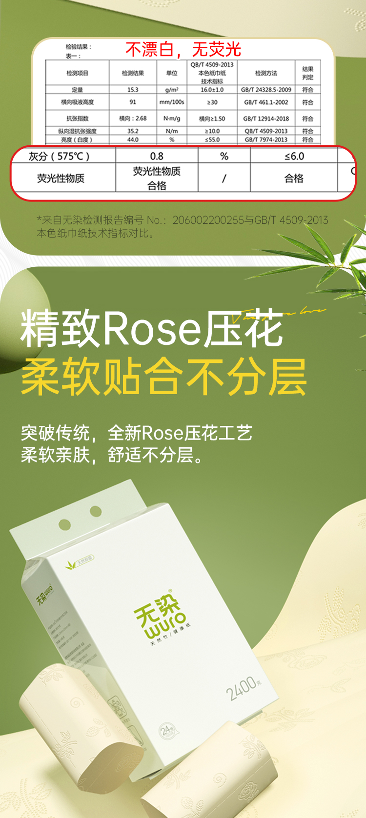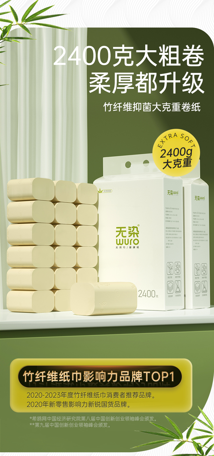 wuro/无染抑菌竹纤维无芯卷纸4层100g*24卷WR099