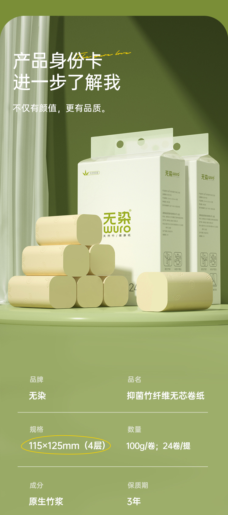 商品名称:wuro/无染抑菌竹纤维无芯卷纸4层100g*24卷WR099