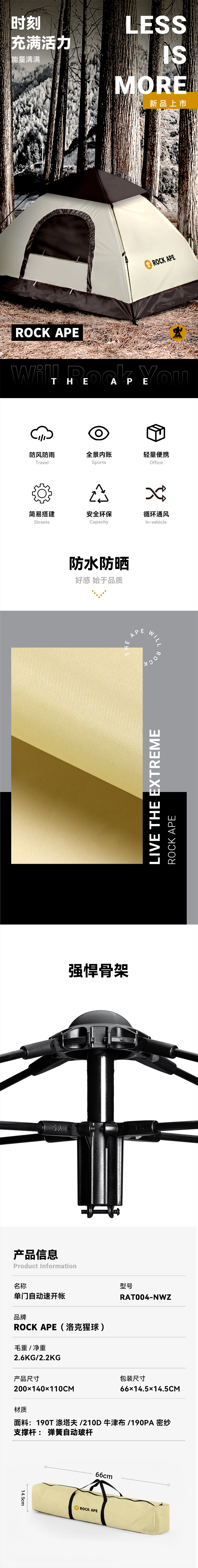 商品名称:ROCK APE/洛克猩球单门自动速开帐篷RAT004-NWZ