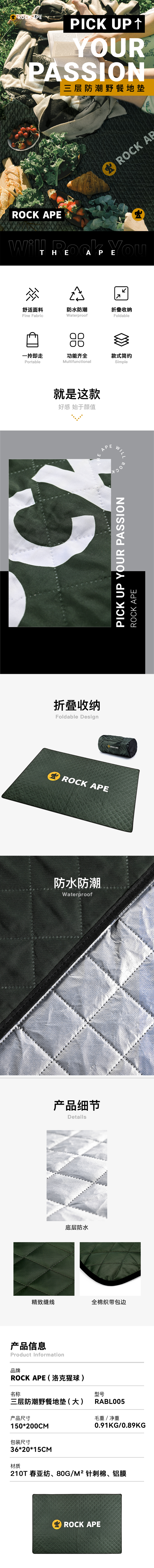 商品名称:ROCK APE/洛克猩球大号三层防潮野餐地垫RABL005
