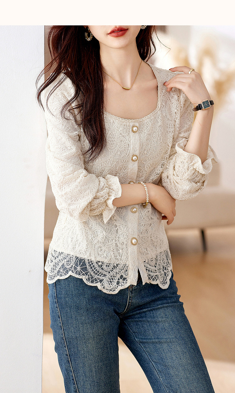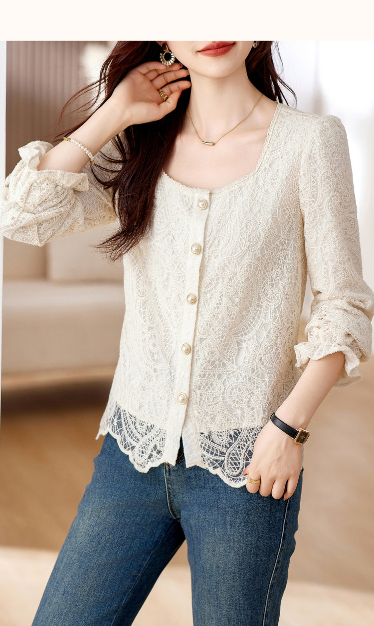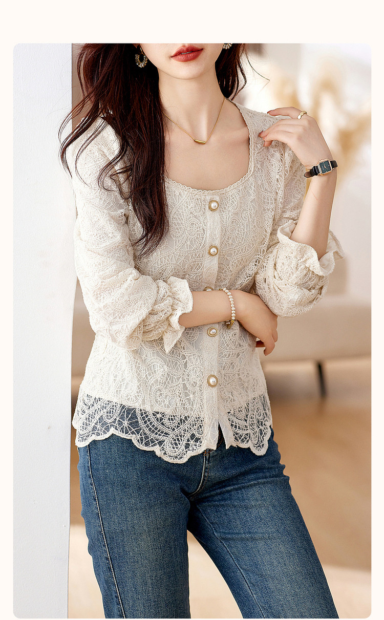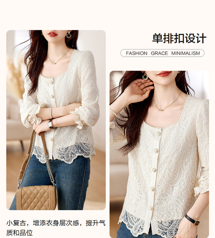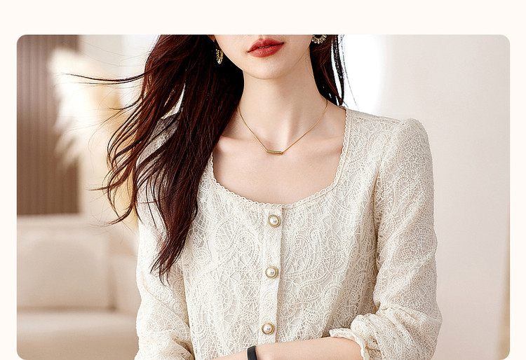 商品名称:【优雅刺绣衬衫】秋方领甜美娃娃袖蕾丝衬衣女装上衣 129217