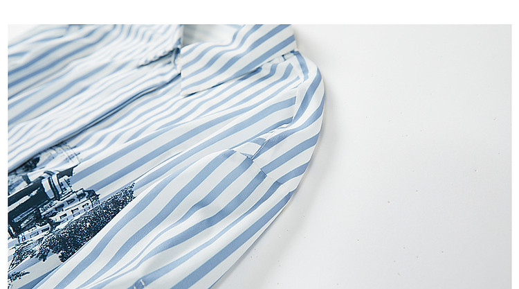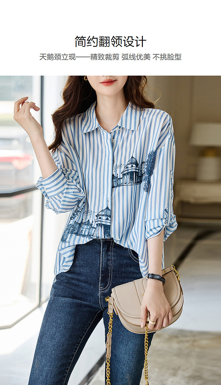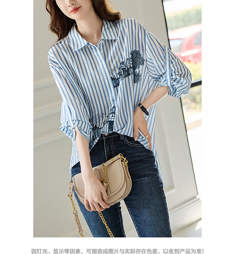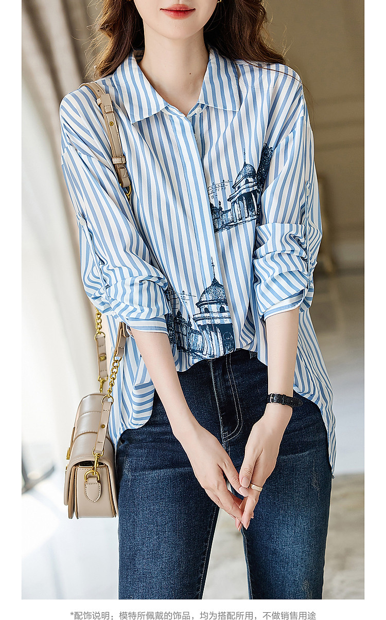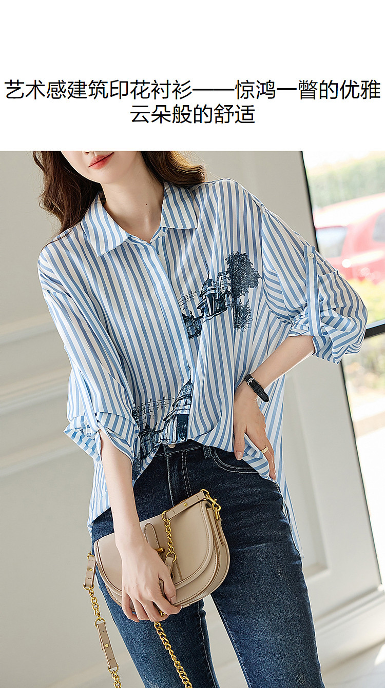 商品名称:【城市漫游】春秋艺术感条纹建筑印花衬衫落肩舒适藏肉衬衣女上衣 736001