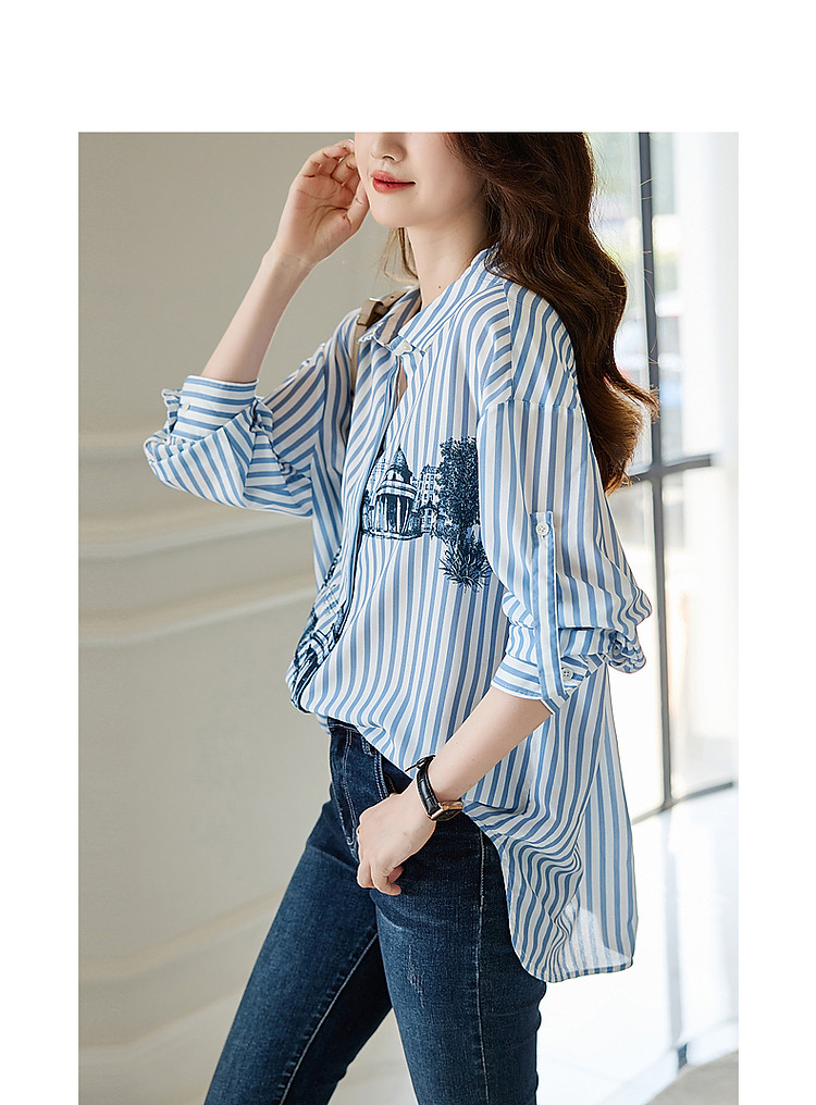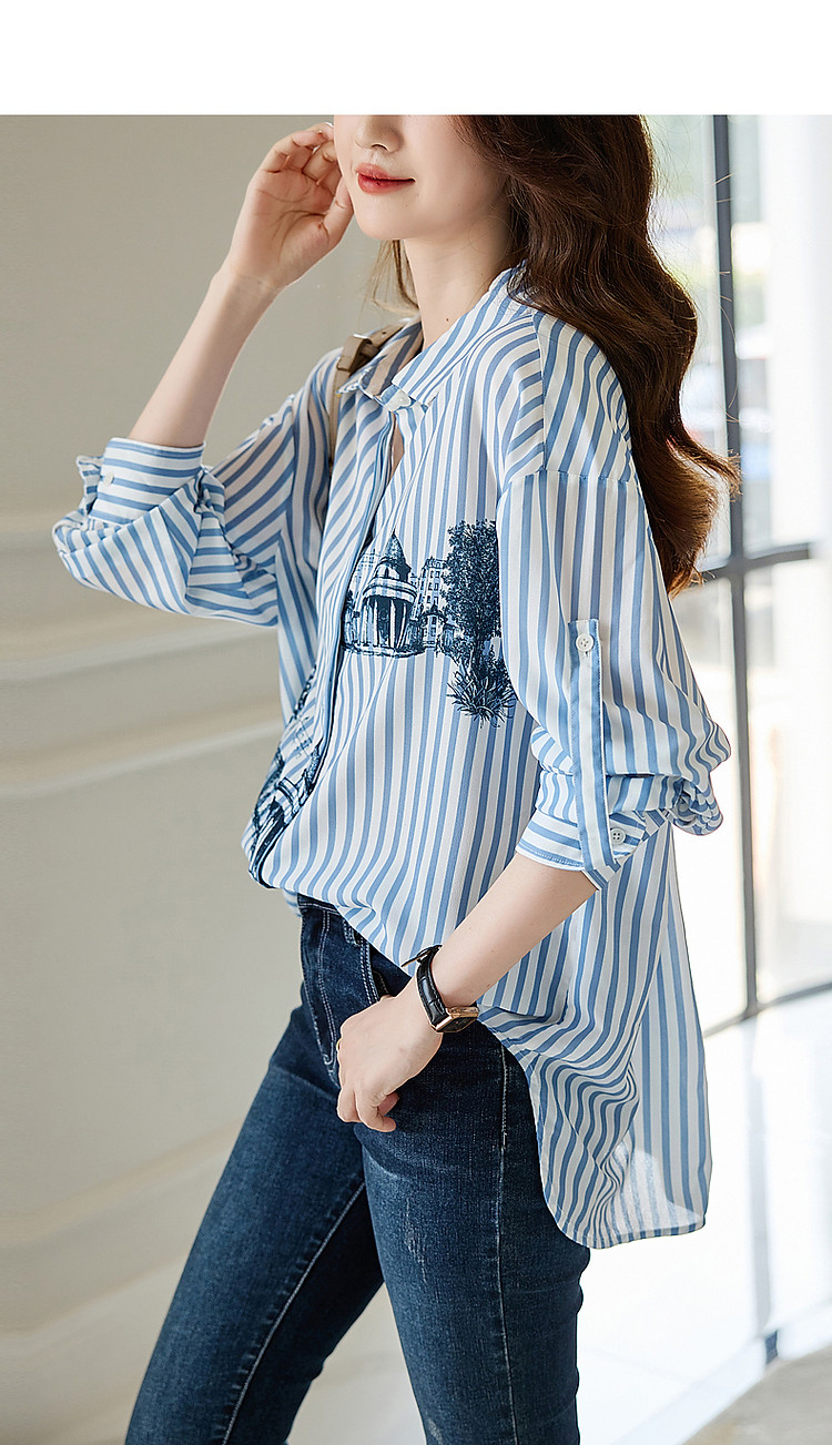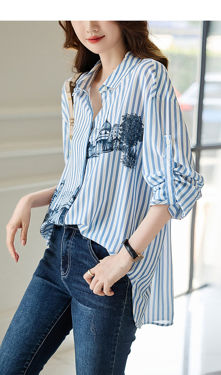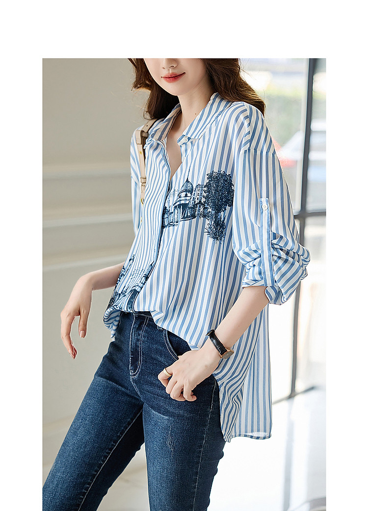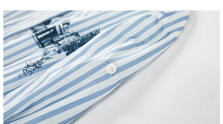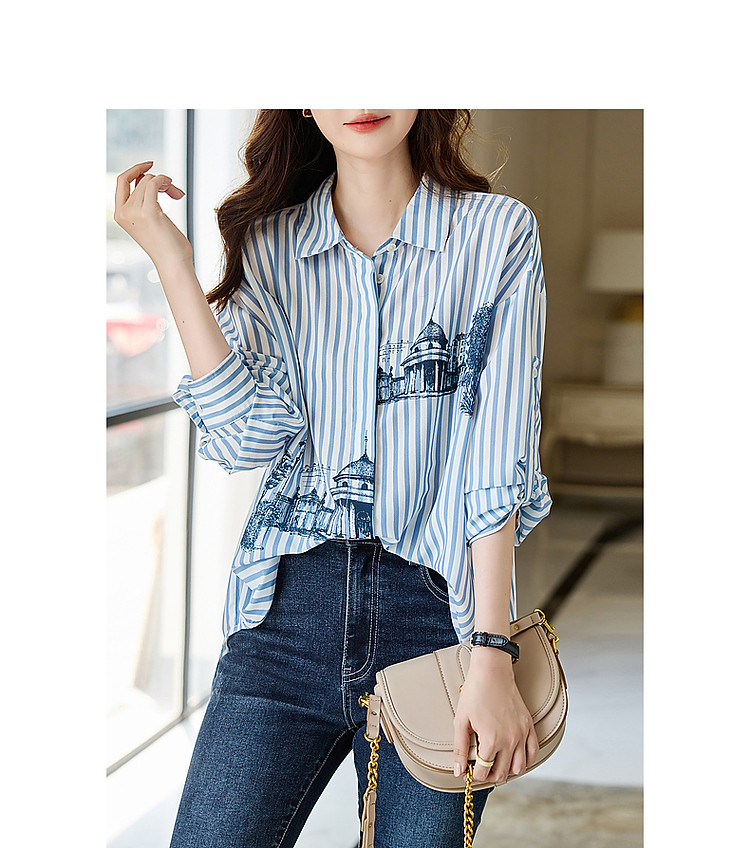商品名称:【城市漫游】春秋艺术感条纹建筑印花衬衫落肩舒适藏肉衬衣女上衣 736001