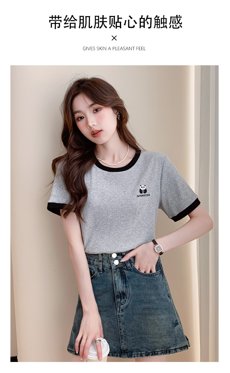 拼接爆款甜美风夏季女式短袖T恤修身透气时尚印花圆领漂亮女上衣 351425