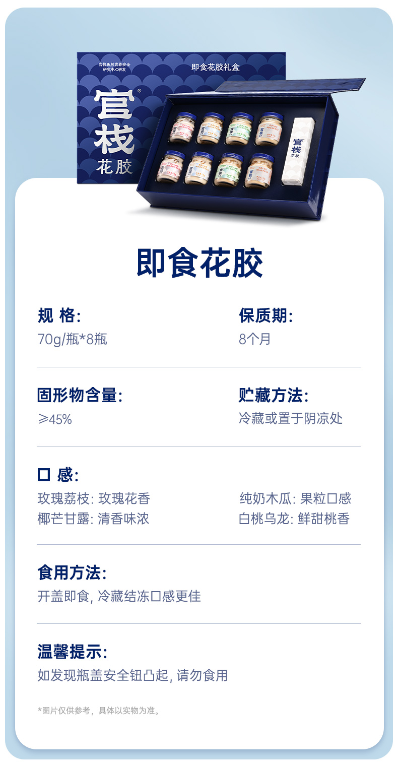 商品名称:官栈即食花胶四种口味礼盒装70g*8瓶