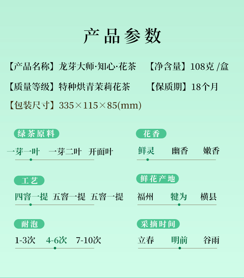 商品名称:龙芽大师知心系列特种烘青茉莉花茶礼盒装108g