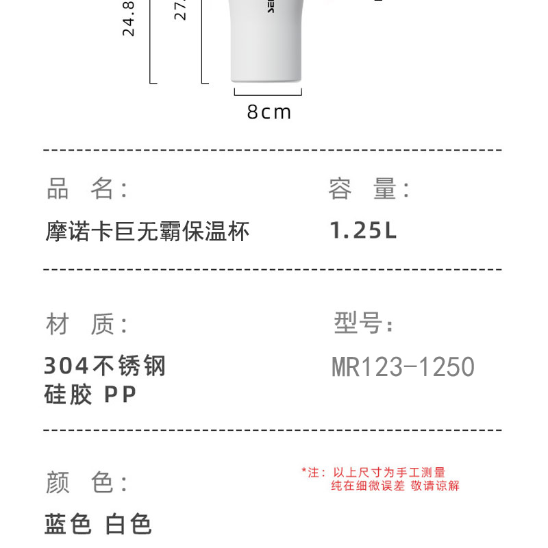 商品名称:SEMREO/斯密欧1.25升摩诺卡巨无霸保温杯MR123-1250