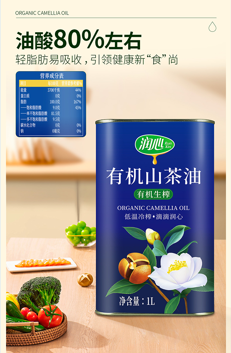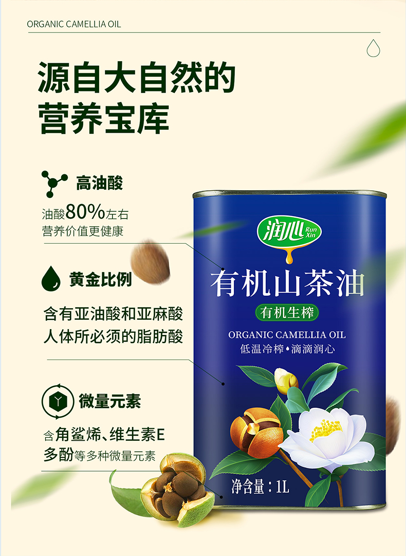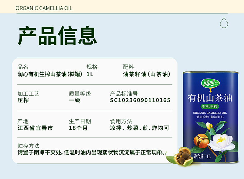 商品名称:【京东/顺丰配送】润心有机生榨山茶油铁罐装1L