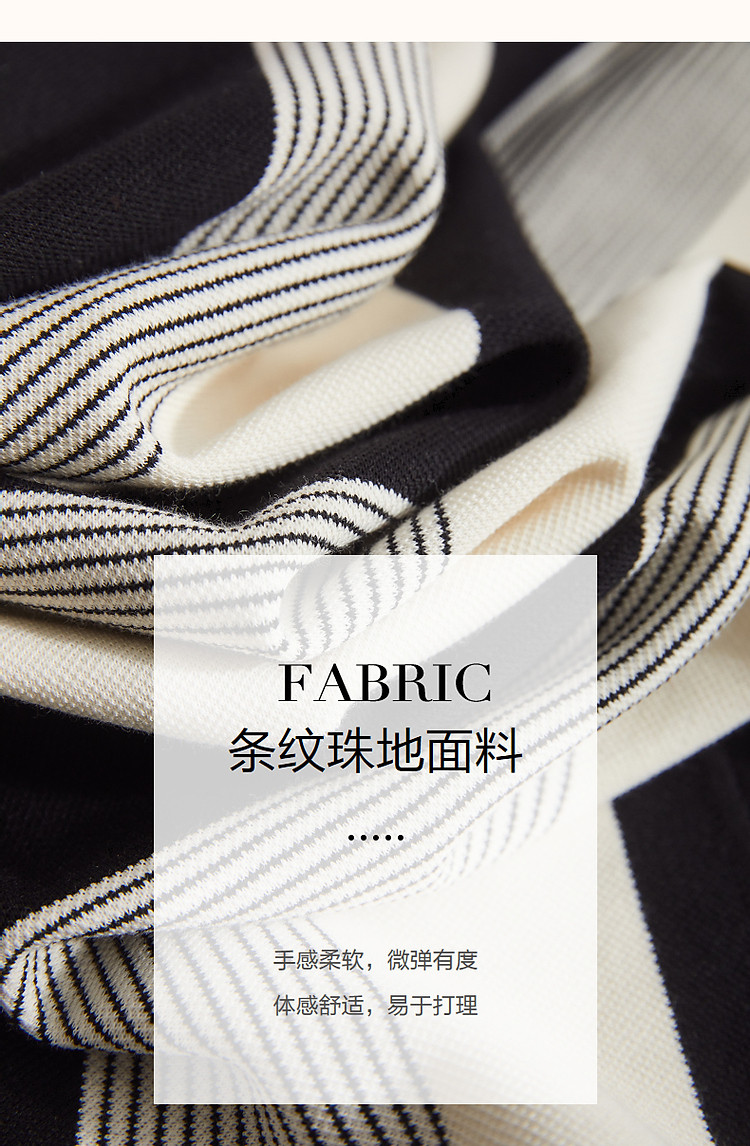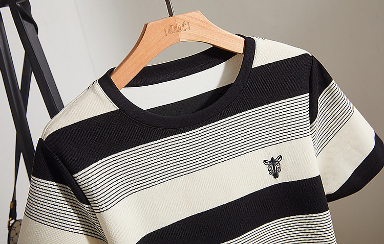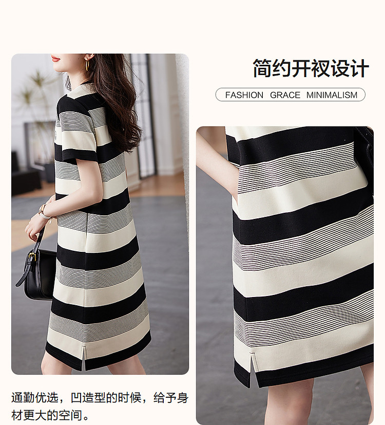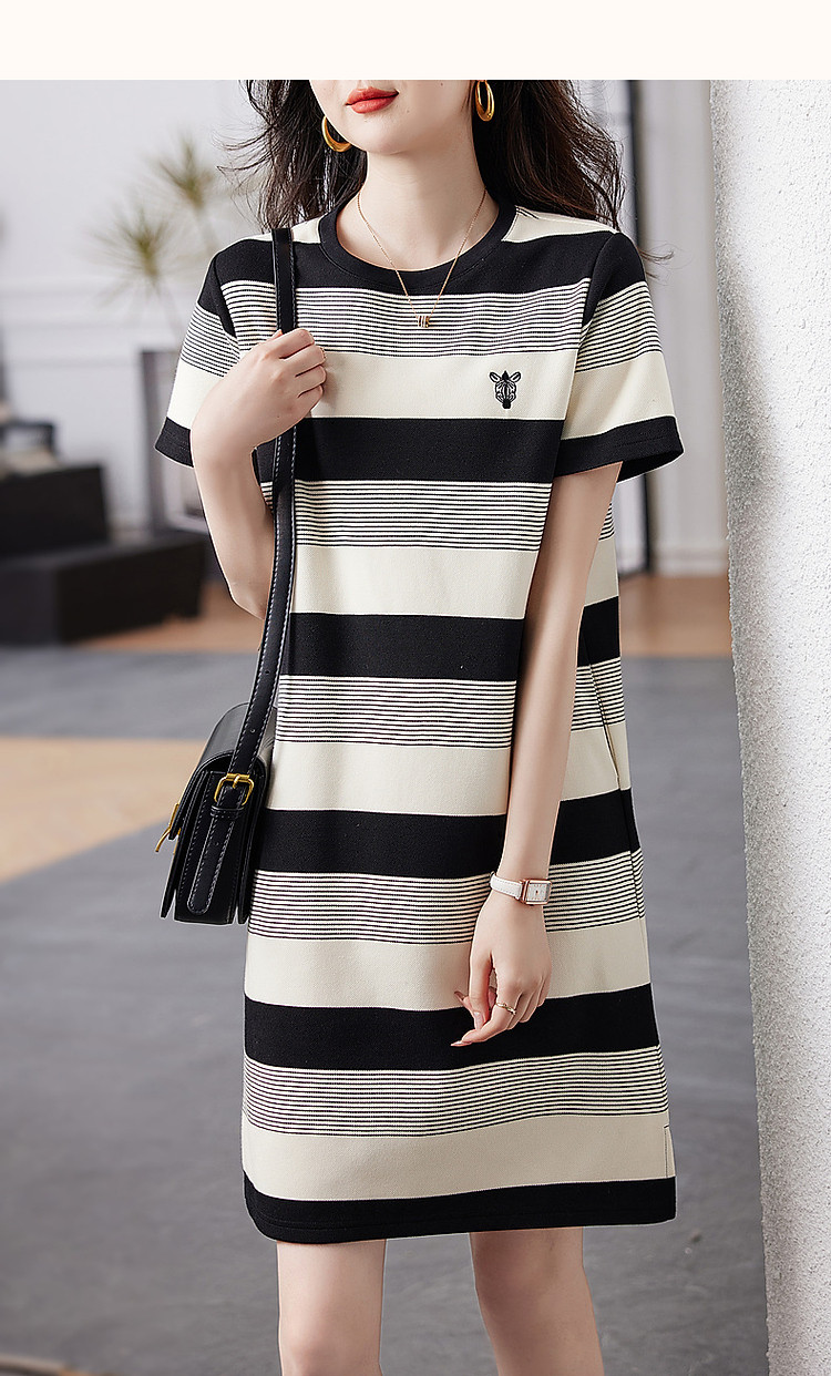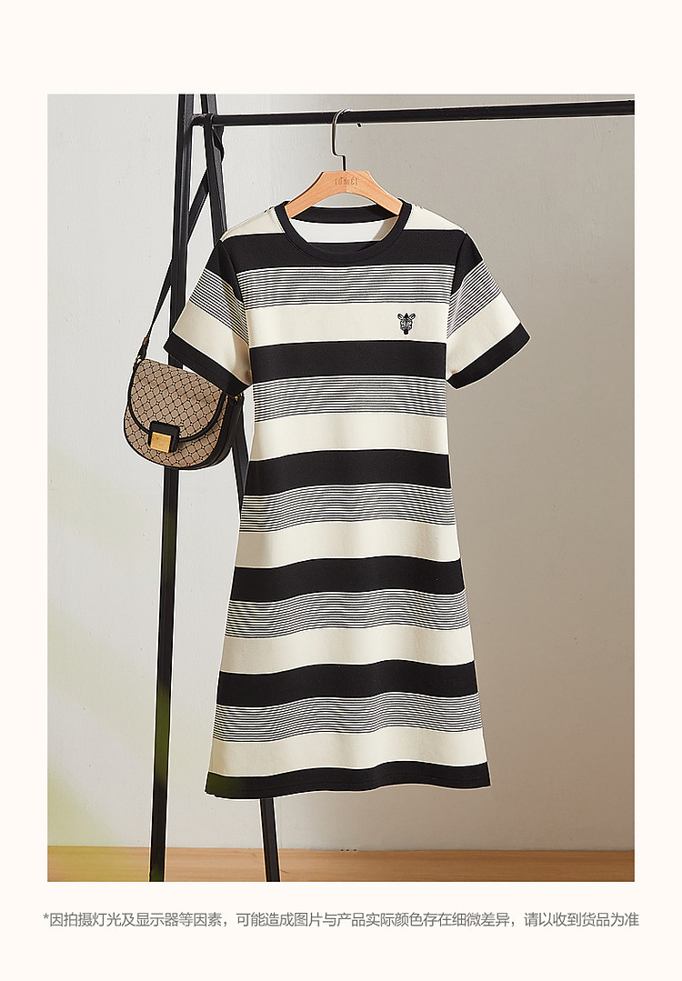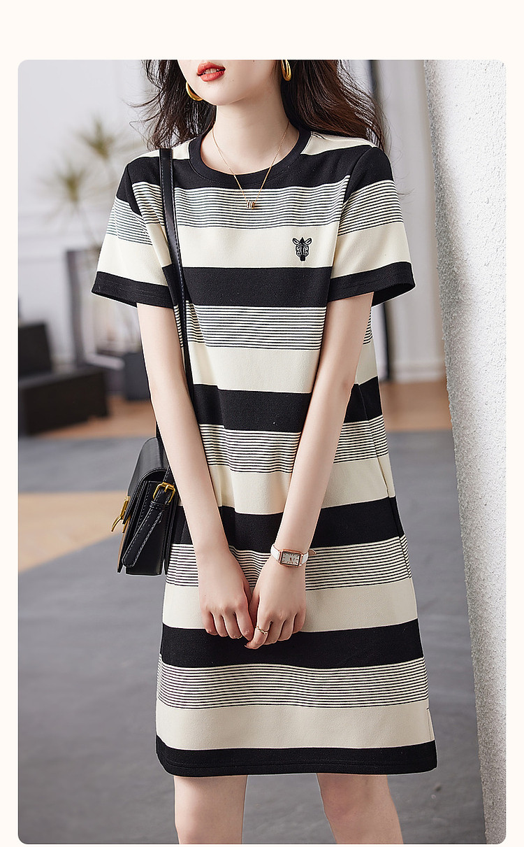 商品名称:【条纹珠地斑马绣花t恤裙】春秋圆领开衩短袖连衣裙女中长款 218817