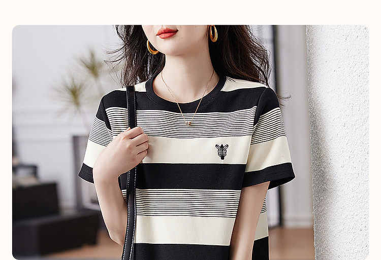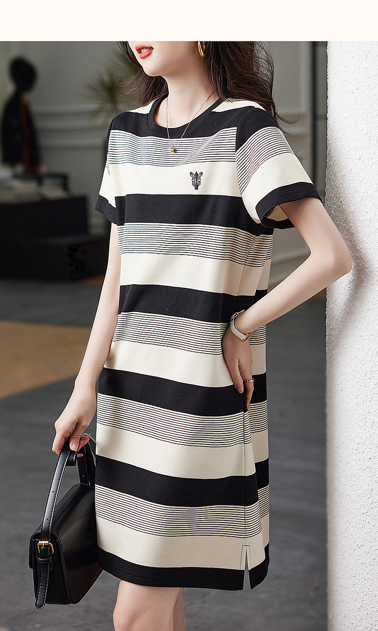 【条纹珠地斑马绣花t恤裙】春秋圆领开衩短袖连衣裙女中长款 218817