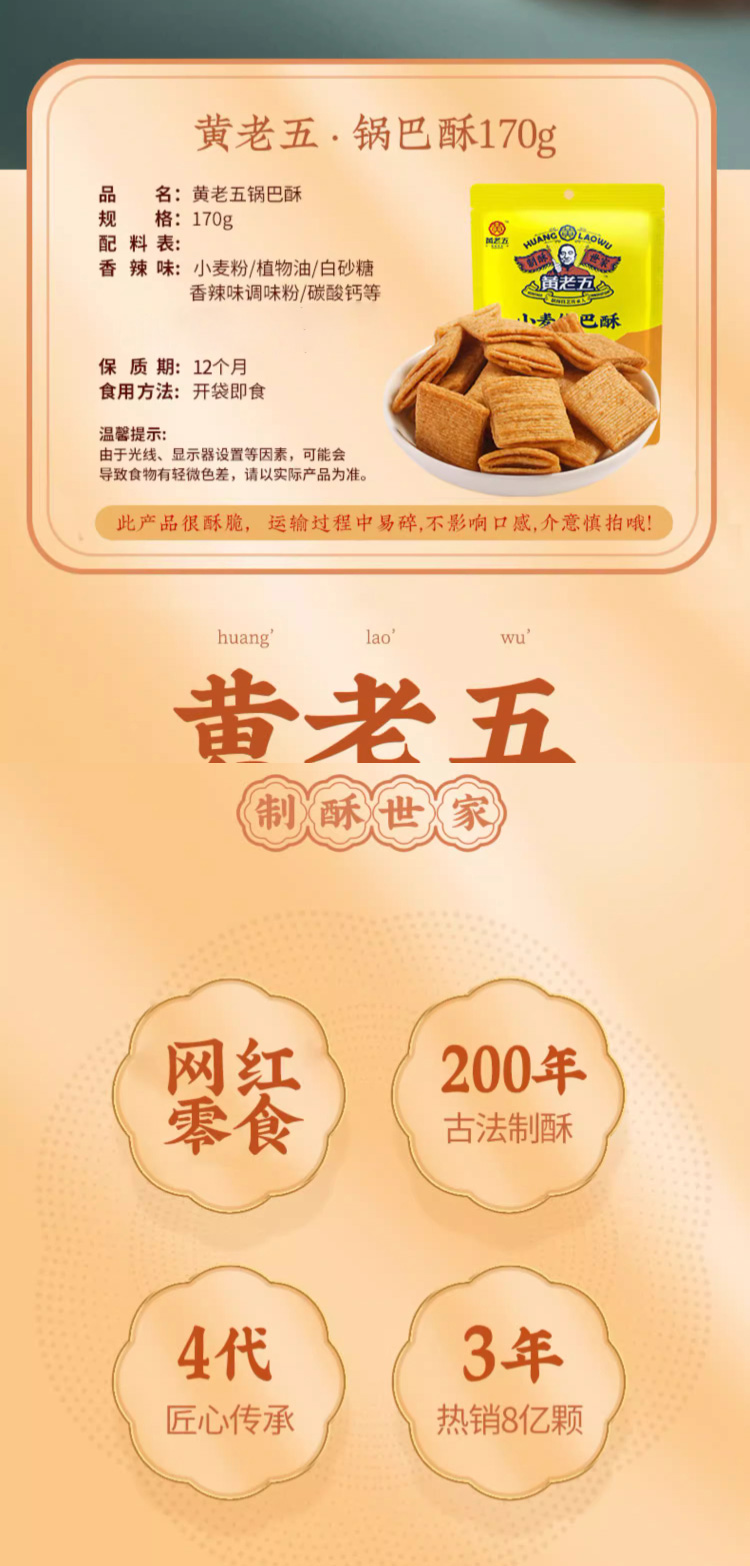 商品名称:黄老五锅巴酥-香辣味170g*8袋