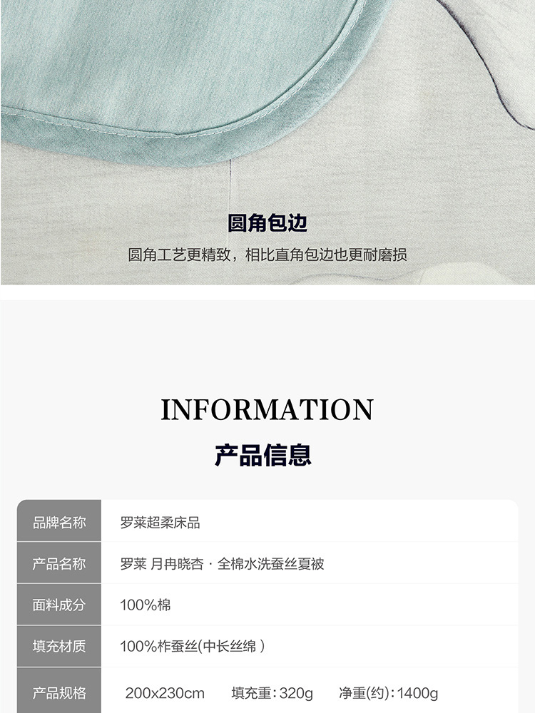 商品名称:【京东/顺丰配送】LUOLAI/罗莱家纺月冉晓杏全棉水洗蚕丝夏被200*230cm 1400g