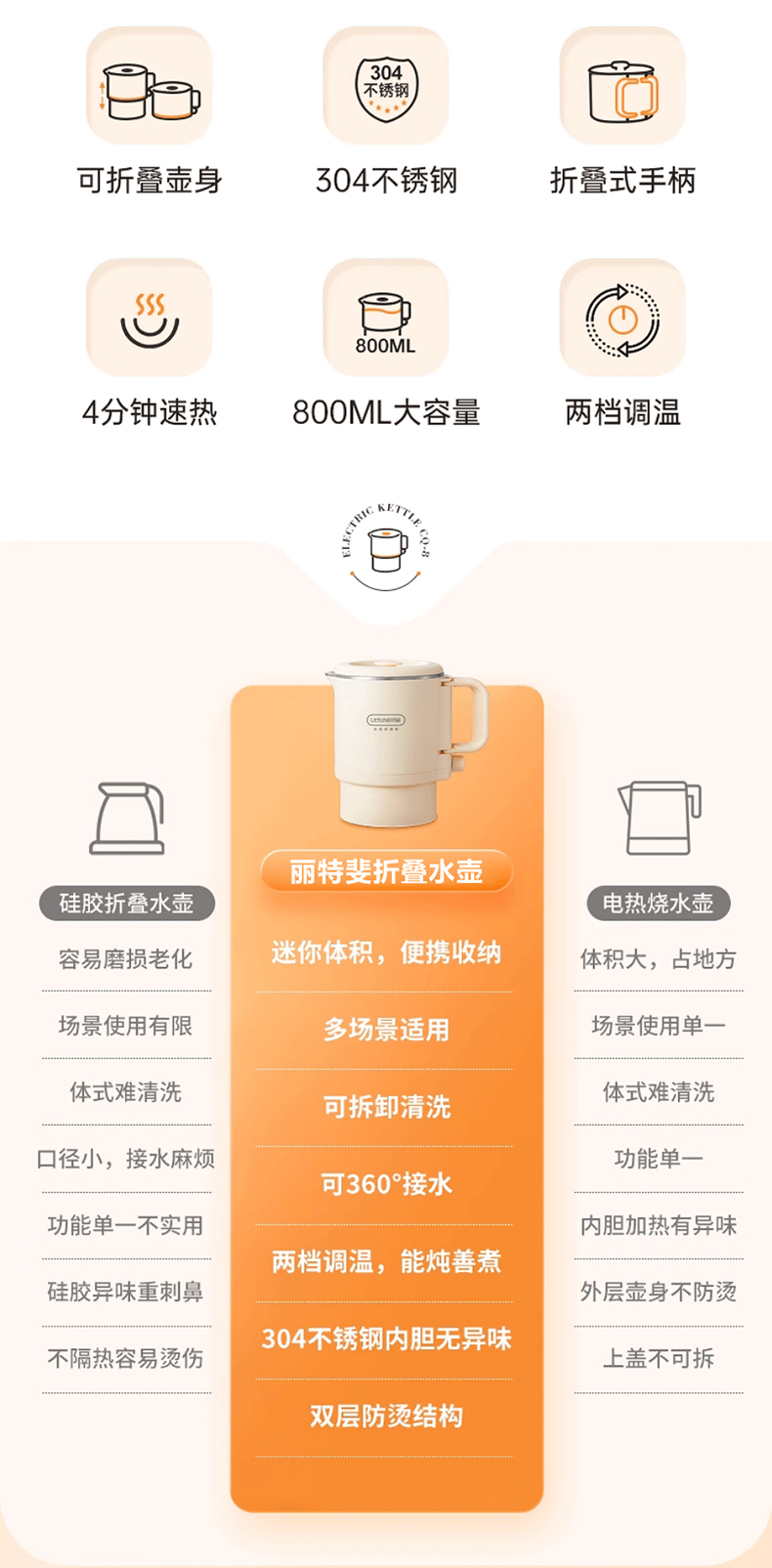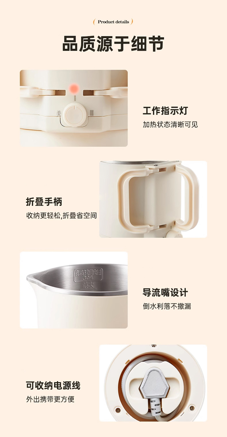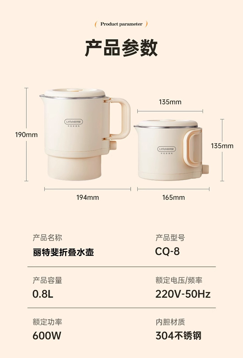 商品名称:Litfish/丽特斐800毫升多功能不锈钢折叠电水壶CQ-8