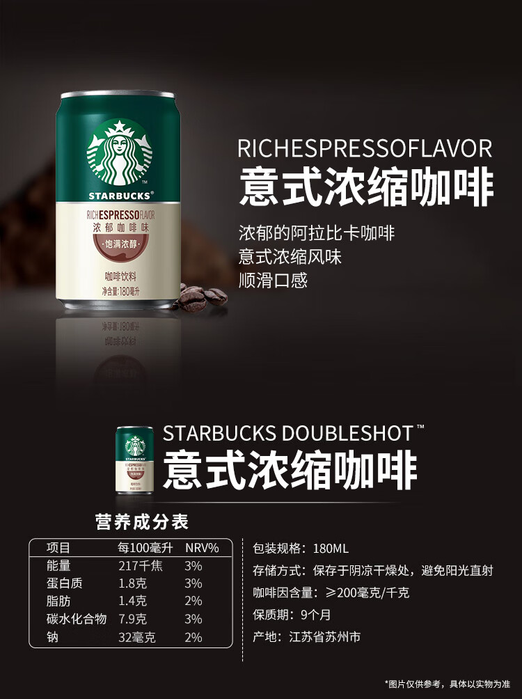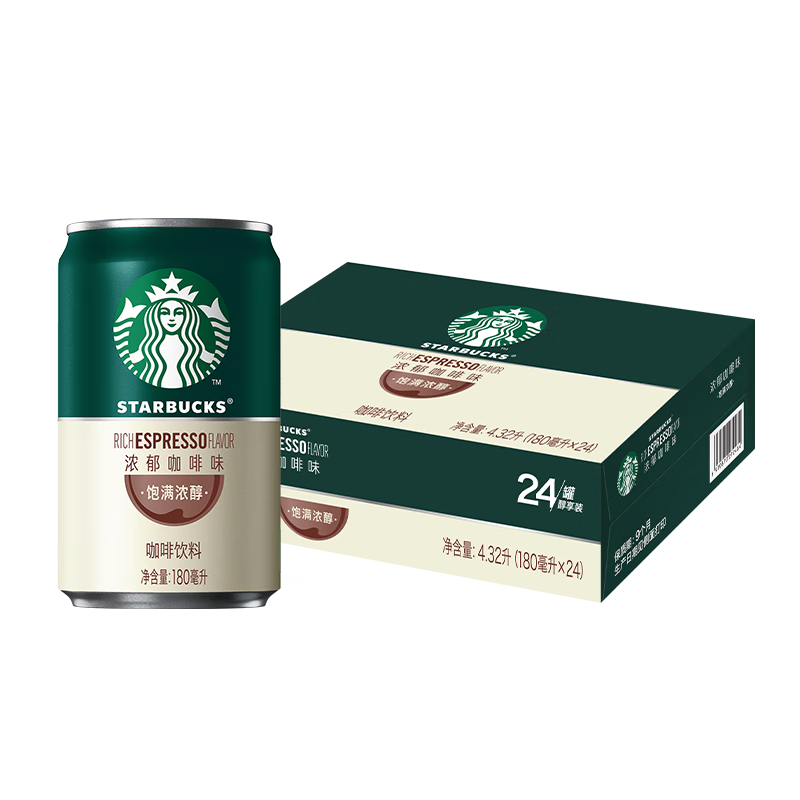 商品名称:STARBUCKS/星巴克星倍醇浓郁咖啡味灌装咖啡饮料整箱180ml*24罐