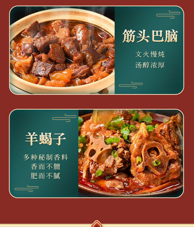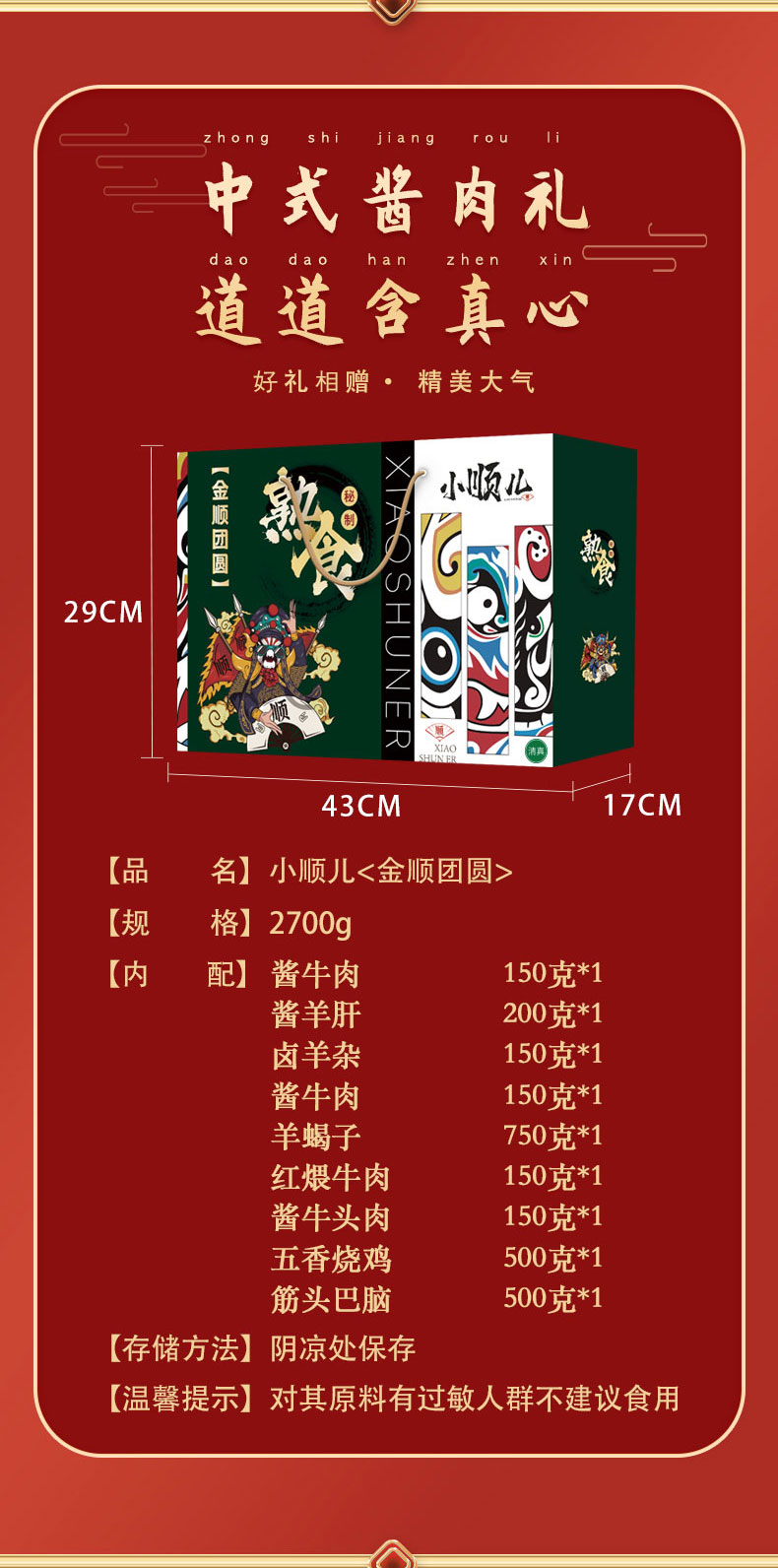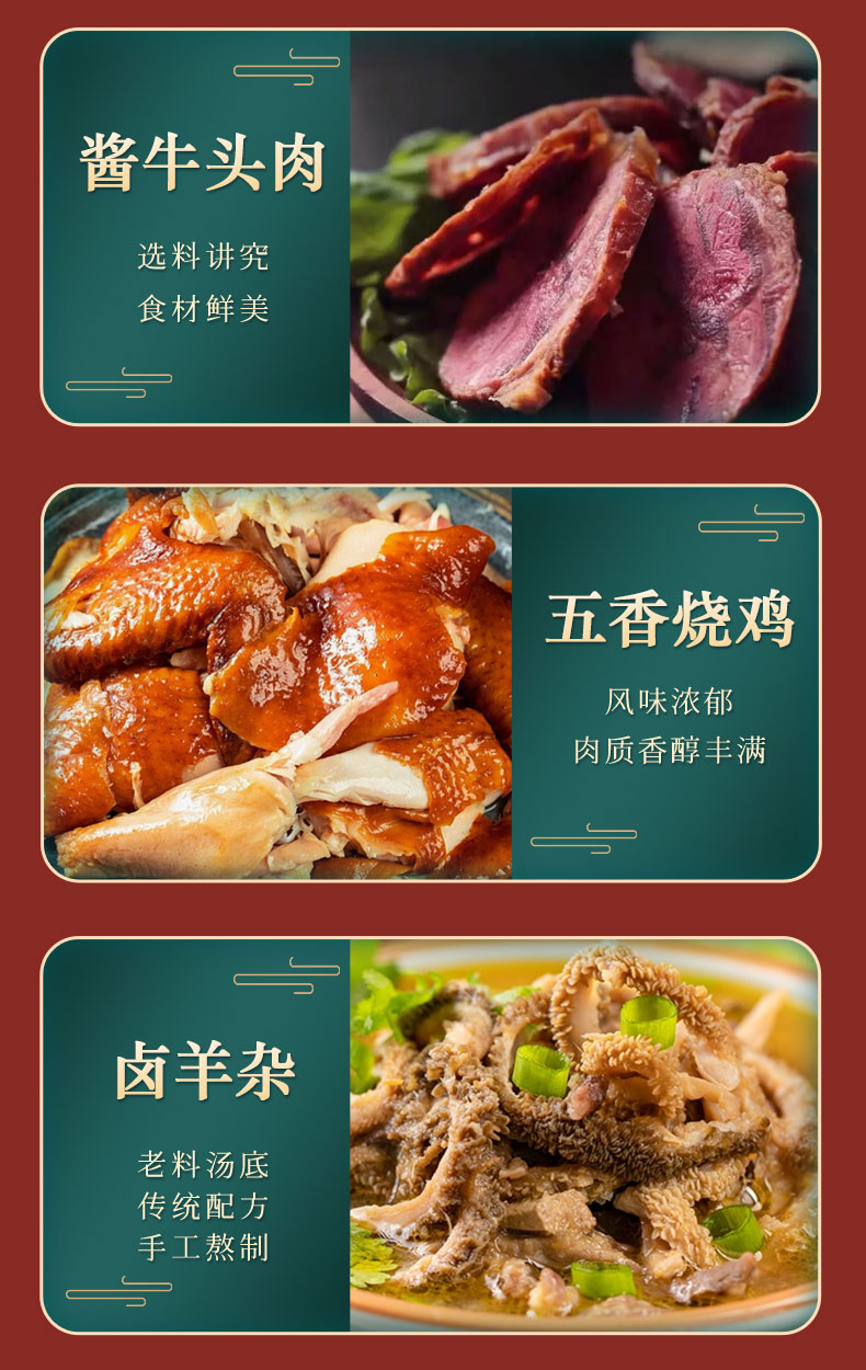 规格配置:酱牛肉 150克*1 酱牛肉 150克*1 酱羊肝 200克*1 卤羊杂 150克*1 羊蝎子 750克*1 红煨牛肉五香150克*1 酱牛头肉150克*1 筋头巴脑500克*1 烧鸡500克*1