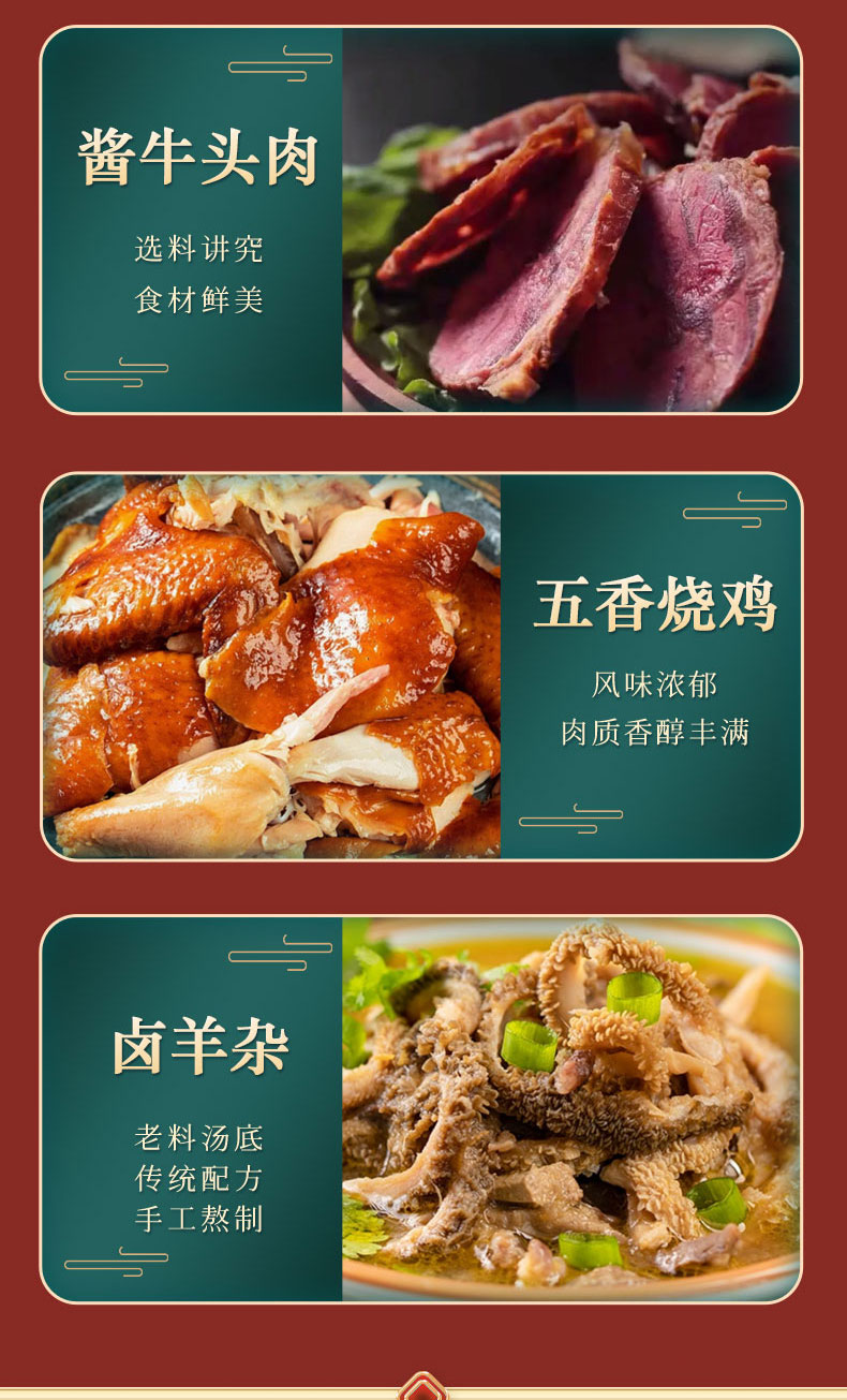 规格配置:酱牛肉 150克*1 酱牛肉150克*1 酱羊肝 200克*1 卤羊杂 150*1 红煨牛肉五香150克*1 酱牛头150克*1 烧鸡500克*1