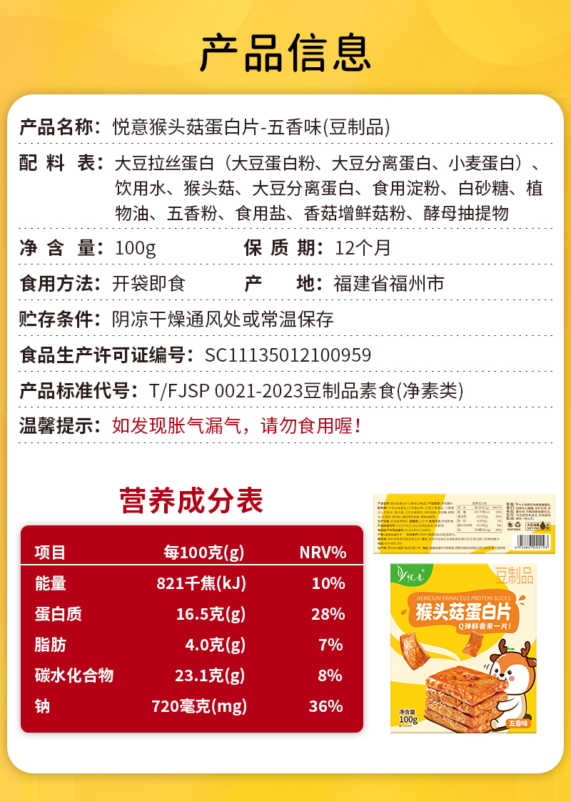 商品名称:悦意五香味猴头菇蛋白片100g*3盒