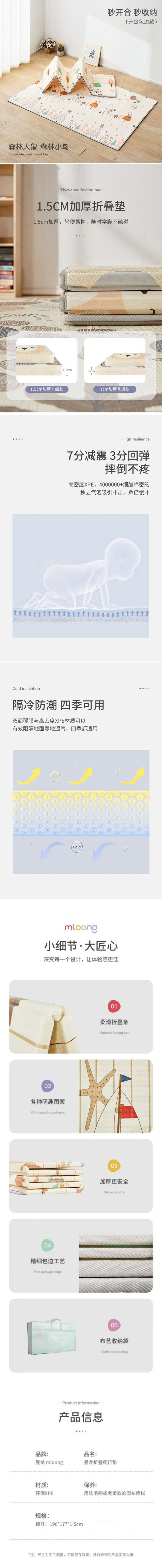 商品名称:Mloong/曼龙折叠款森林大象森林小鸟爬行垫196*177*1.5cm