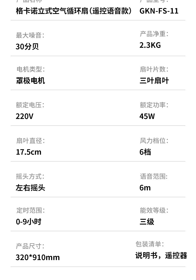 商品名称:GKN/格卡诺遥控语音款立式空气循环扇GKN-FS-11