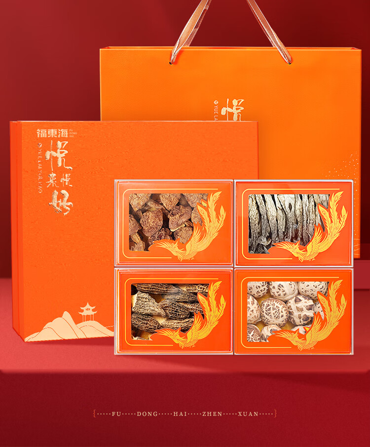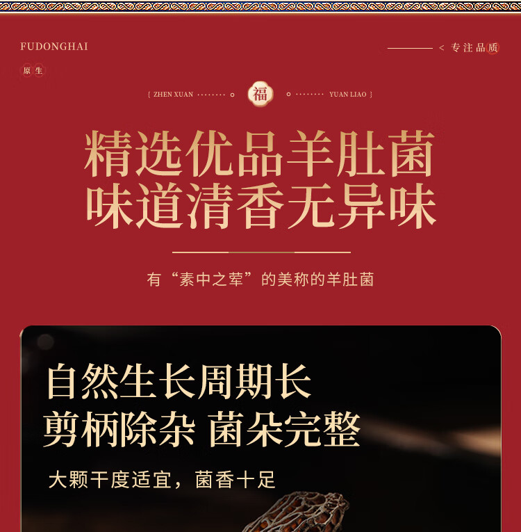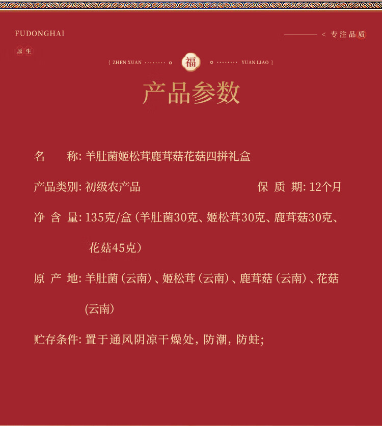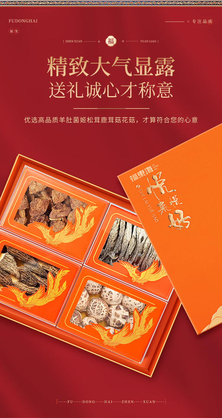 商品名称:福东海羊肚菌姬松茸鹿茸菇花菇四拼礼盒135g