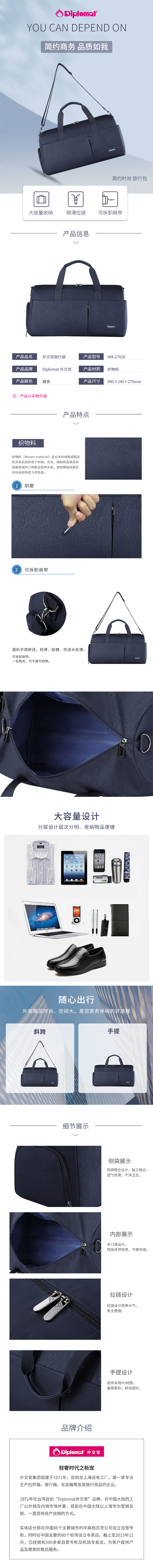 商品名称:【京东/顺丰配送】Diplomat/外交官旅行袋-藏青色HM-2702E