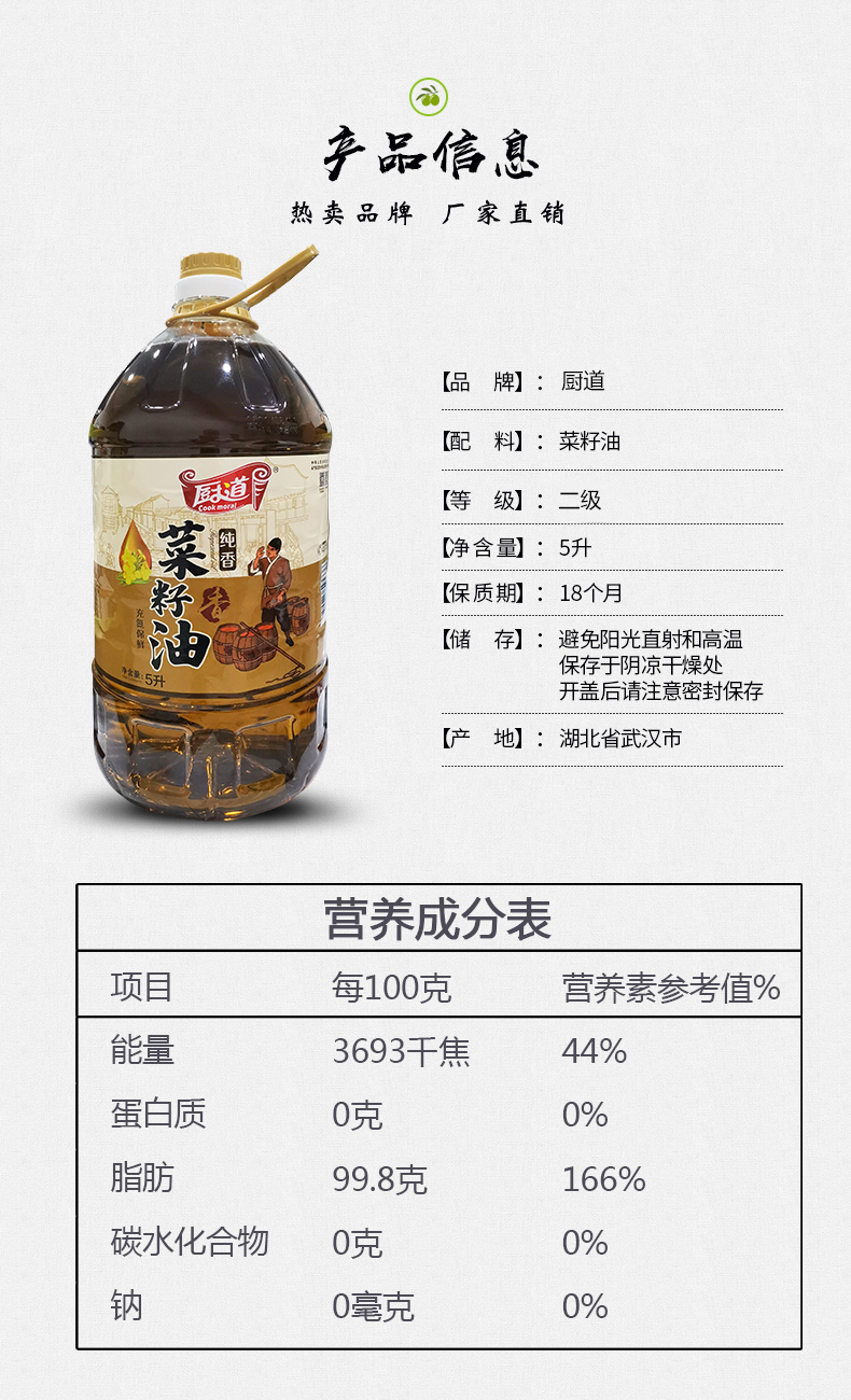 商品名称:Cook moral/厨道纯香菜籽油5L